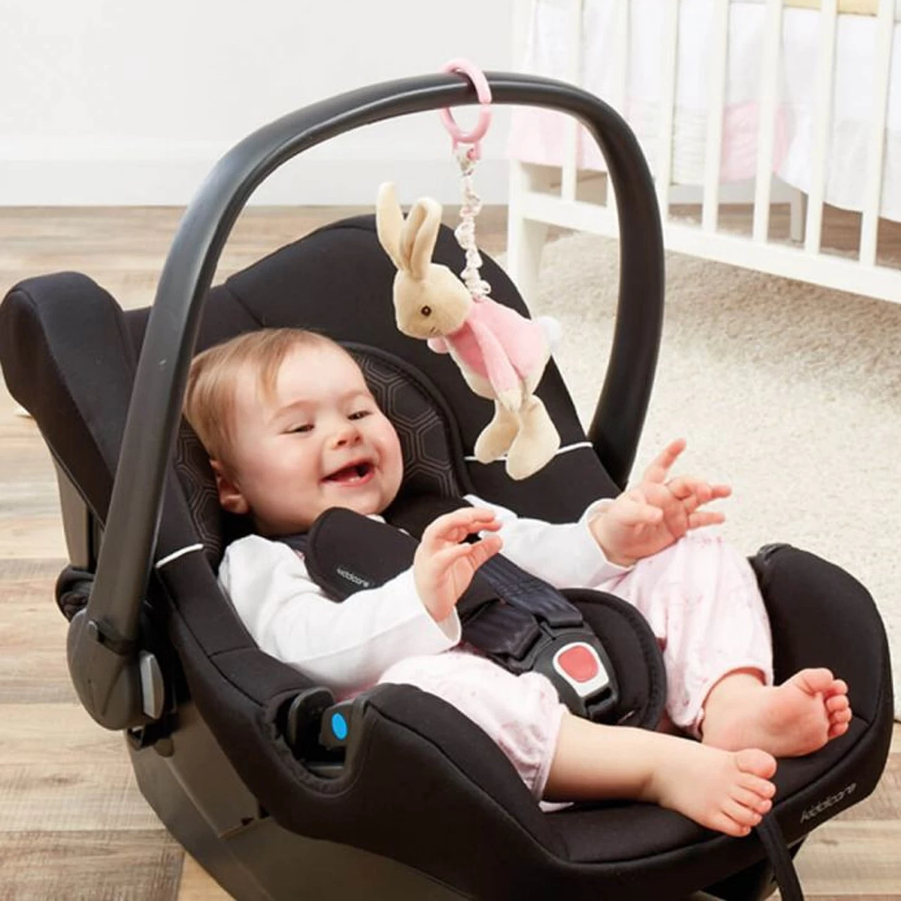 Watch me jiggle! Designed to keep baby engaged, this beautifully crafted Beatrix Potter Flopsy Bunny jiggle toy is fun, tactile and engaging. The perfect size for little hands to grasp and pull down, watch baby giggle with laughter as Flopsy jiggles back up. A pink attachable hook makes this baby toy the perfect on-the-go companion for a stroller, car seat or cot. Made from baby-safe embroidered fabric, this bunny makes a great newborn gift for a baby girl.