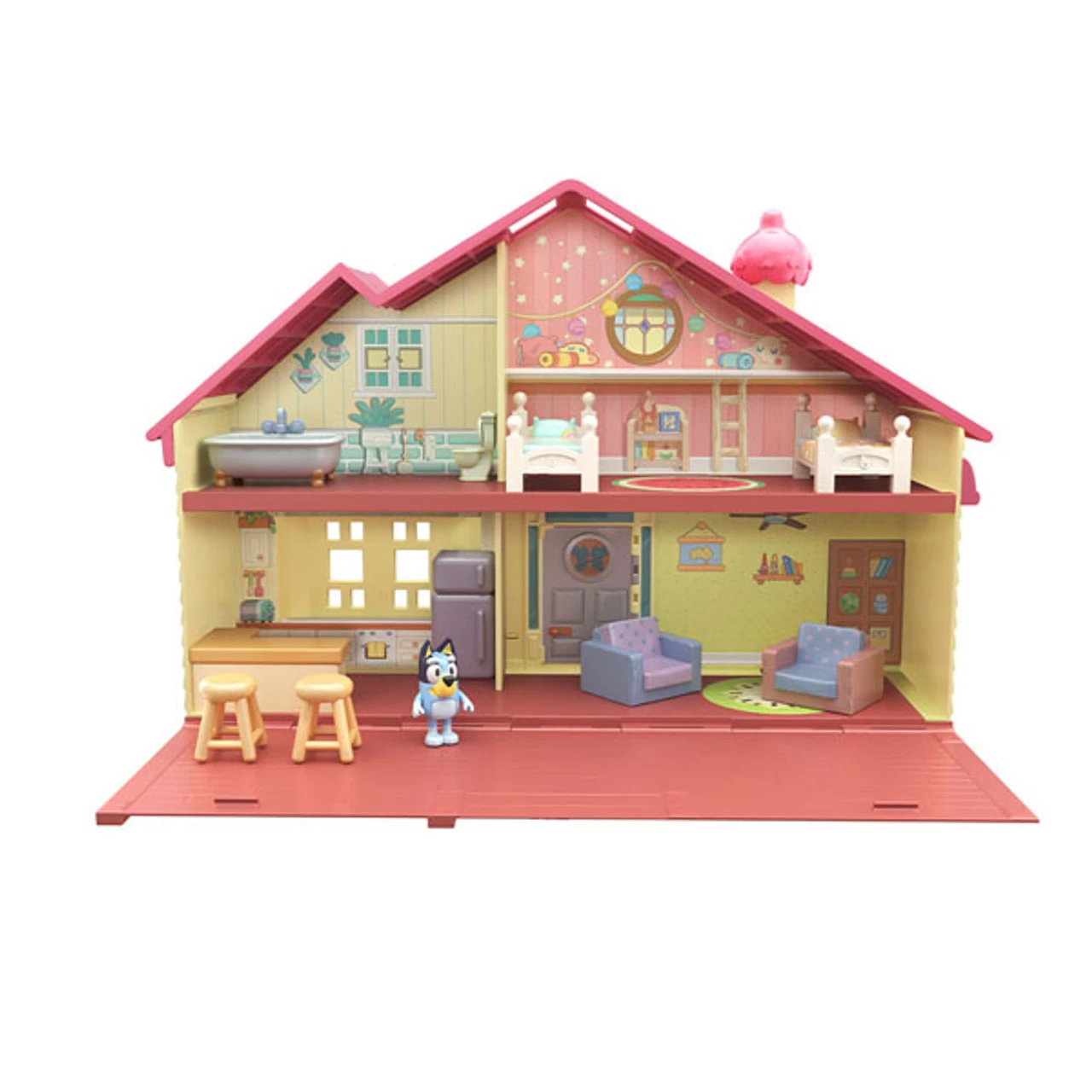 Recreate some of the most memorable moments from the show in the Bluey Family Home playset! Big in size and features, this enormous toy playset is full moulded details with opening doors. and a large wall panel that pulls down to form an amazing outdoor patio! There is plenty of space for Bluey and her family to play in with four different rooms – a living room, kitchen, bedroom and bathroom. With many pieces of removable furniture including 2 beds, 2 stools, 2 sofas, 2 rugs, a bathtub, toilet, dining room counter and fridge, there is plenty to do in this beautiful home!