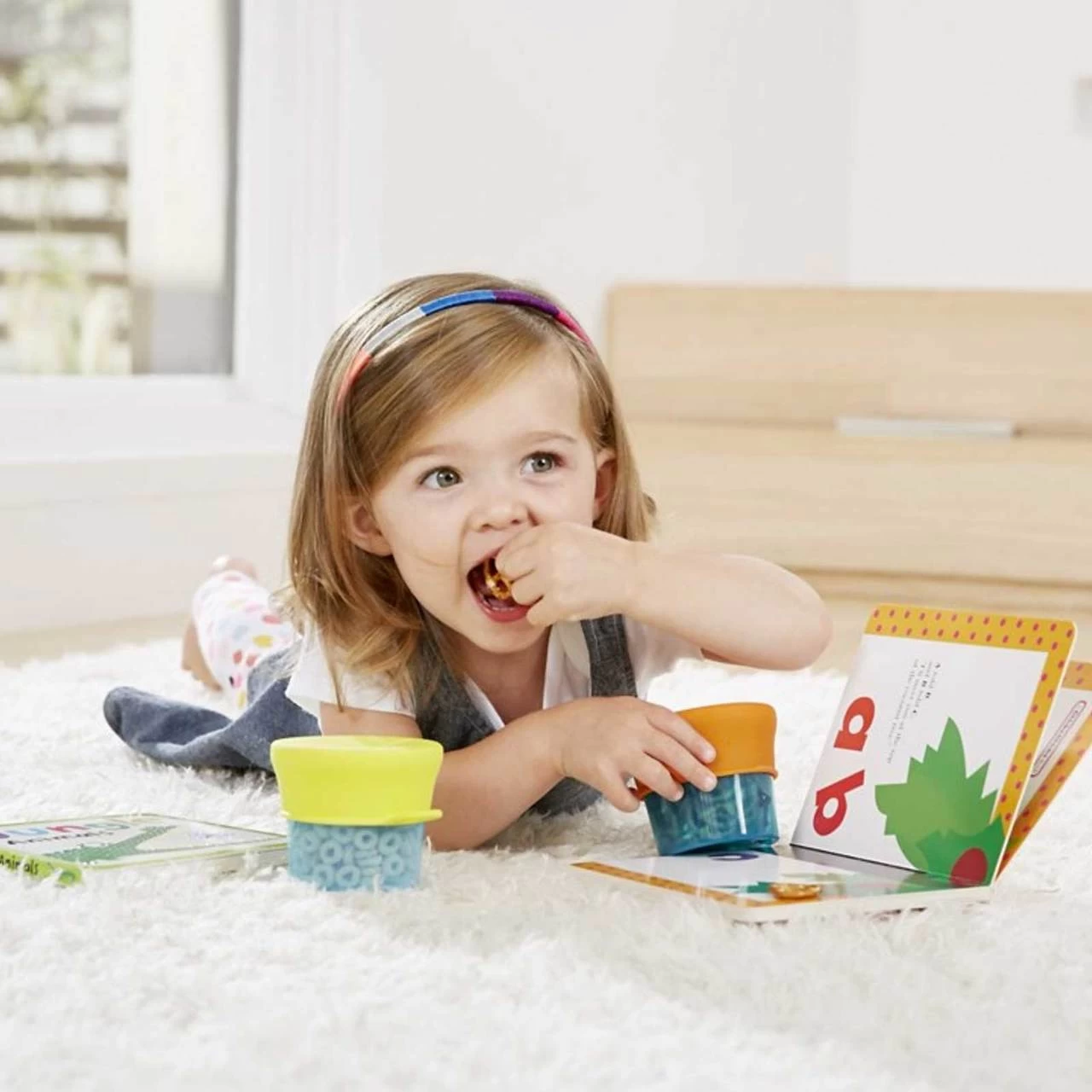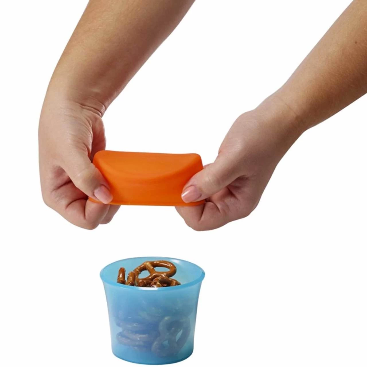 - Silicone trap lid keeps snacks in container