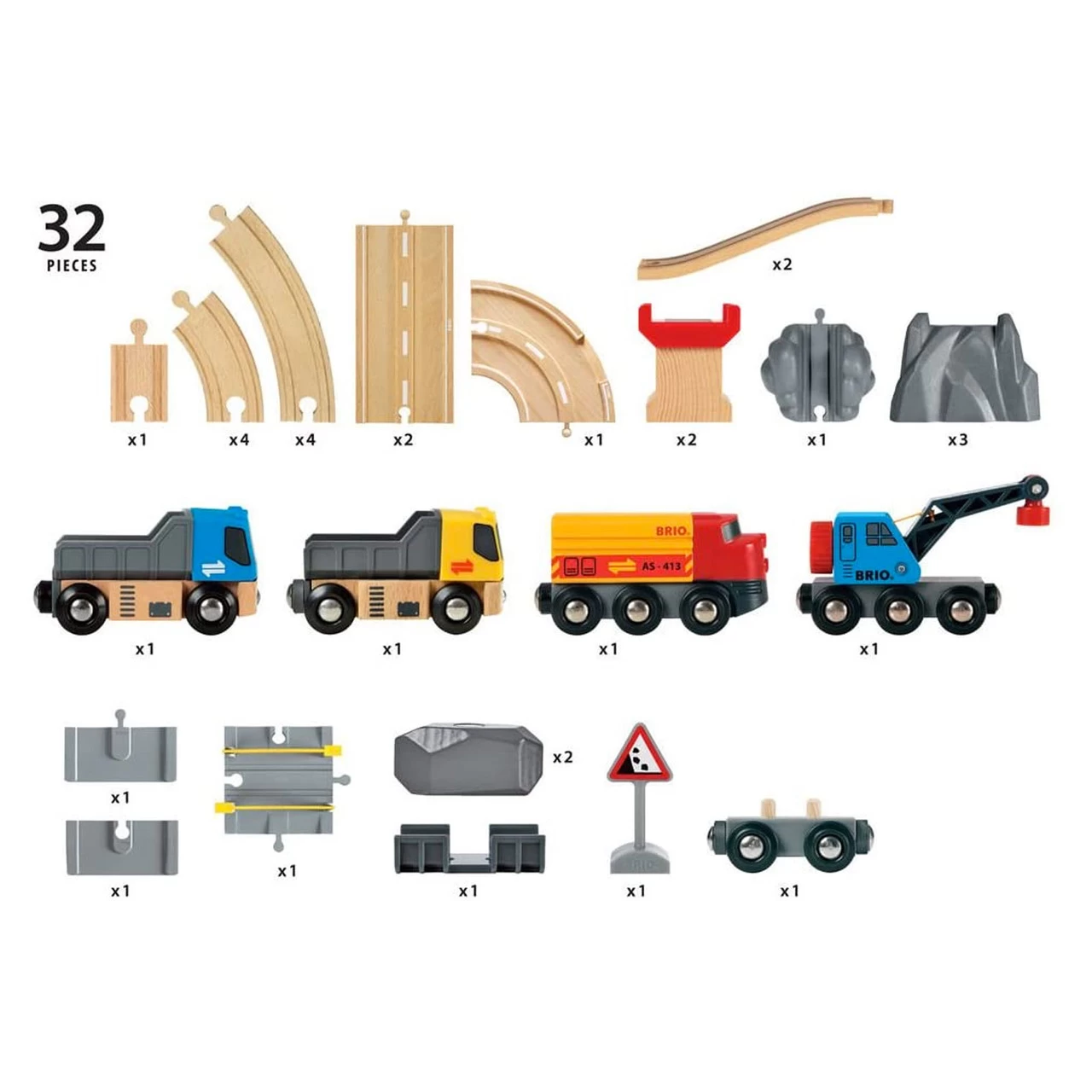 - Includes 13x Pieces of track, 3x Rock supports, 2x Block supports, 1x Level crossing, 1x Mountain pass track, 3x Sections of Road, 2x Freight trucks, 1x Freight Train, 1x Crane wagon, 1x Wagon, 2x Rock loads, 1x Cargo load tray, 1x sign post, 2x Ramps
