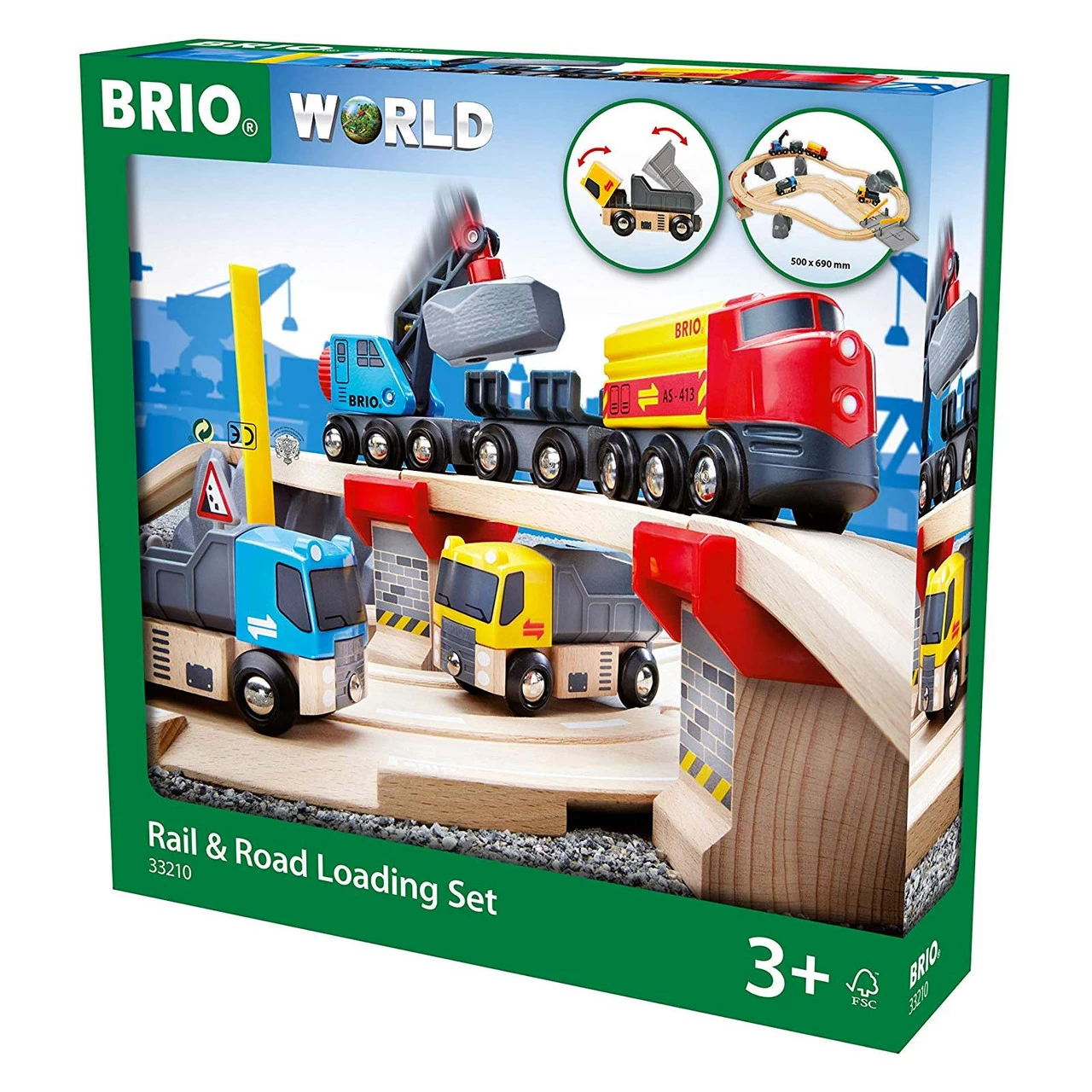 Lift and load! This 32-piece BRIO Rail & Road Loading Set is packed with construction themed vehicles including a portable crane wagon and 2 functioning tipper trucks. Take the action to multiple heights using the railway track supporters and connect up to the roads with the railway crossing. This BRIO rail and road loading set is packed with lots of play features.Â