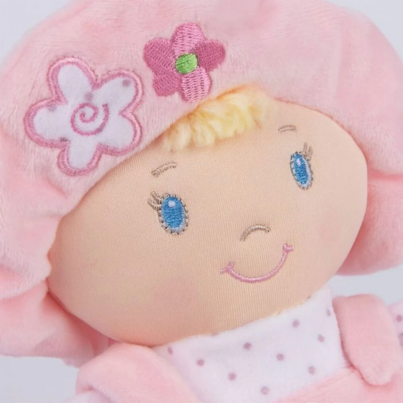 GUND My First Dolly is the perfect baby-safe doll for your little girl. Sweet and soft, this doll is the perfect first friend for your baby girl. My First Dolly has a sweet embroidered face, a pink hat with flowers, and a pink jumper with “My First Dolly” in embroidery. Snuggly soft and sure to be her favourite naptime and playtime friend.
