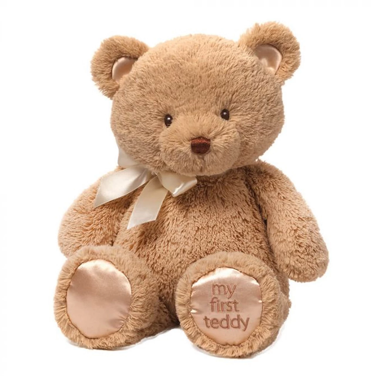 This Gund My First Teddy is crafted of super-soft plush, has satin paws, an organza ribbon around her neck, an embroidered nose. The teddy bear has embroidered foot pad that reads “My First Teddy”. This guy makes the perfect gift for a newborn baby, or a stunning decor piece for the home nursery.
