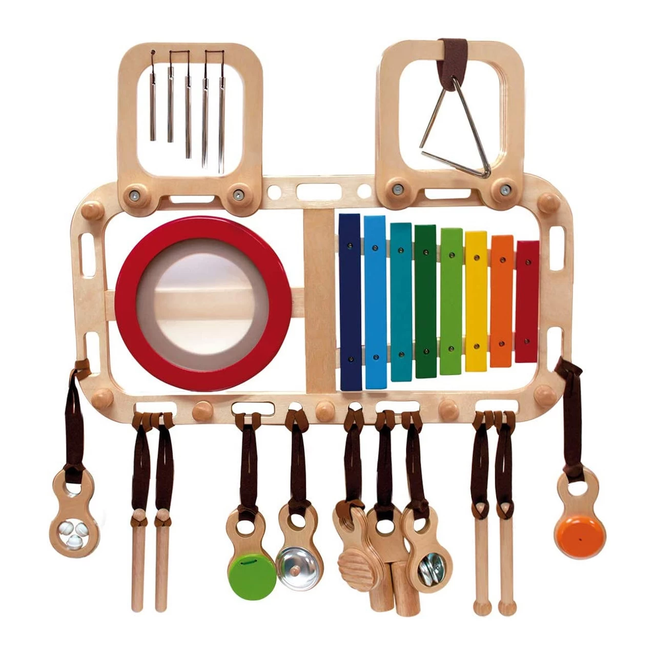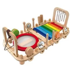 10 sound and music experiences built into a sturdy plywood bench. Includes xylophone, tubular chimes, triangle, cymbal, bells, maracas, castanet and double guiro; plus a pair of rhythm sticks, 2 strikers and a scraper. It can also be attached to a wall (hanging straps included). Made from sustainable rubber wood, plywood and composite wood parts made from low-risk timber species. Finished with non-toxic, child safe paints and lacquers.