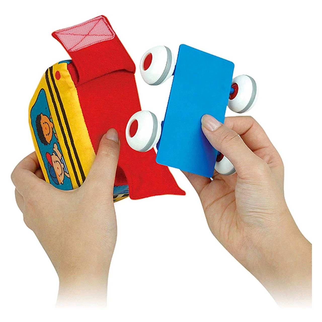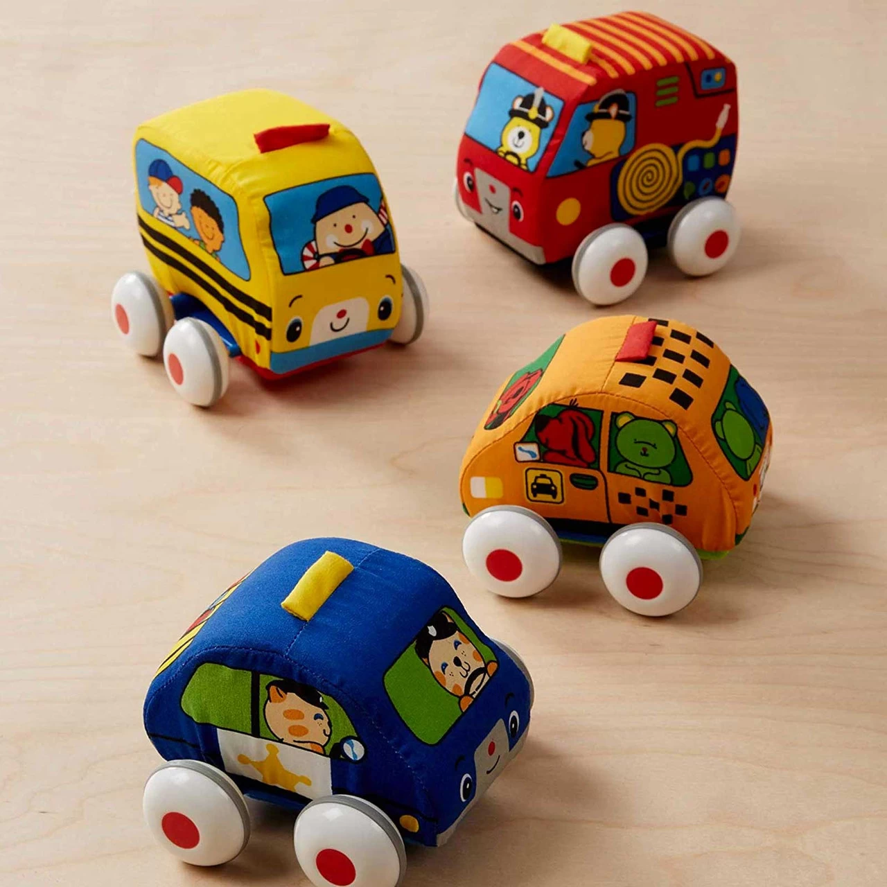 - Includes 4 soft vehicles: school bus, family car, fire truck, police car
