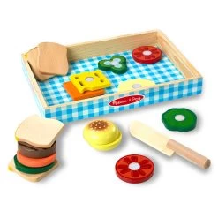 Make your sandwich the way you like it with this Melissa & Doug wooden sandwich kit. Kids will love to slice their sandwich with the wooden knife as a satisfying “crunch” sound will be made. The included wooden storage tray is great for keeping all the toys neat and organised between meals. This wooden toy set will be a hit with any budding chef!