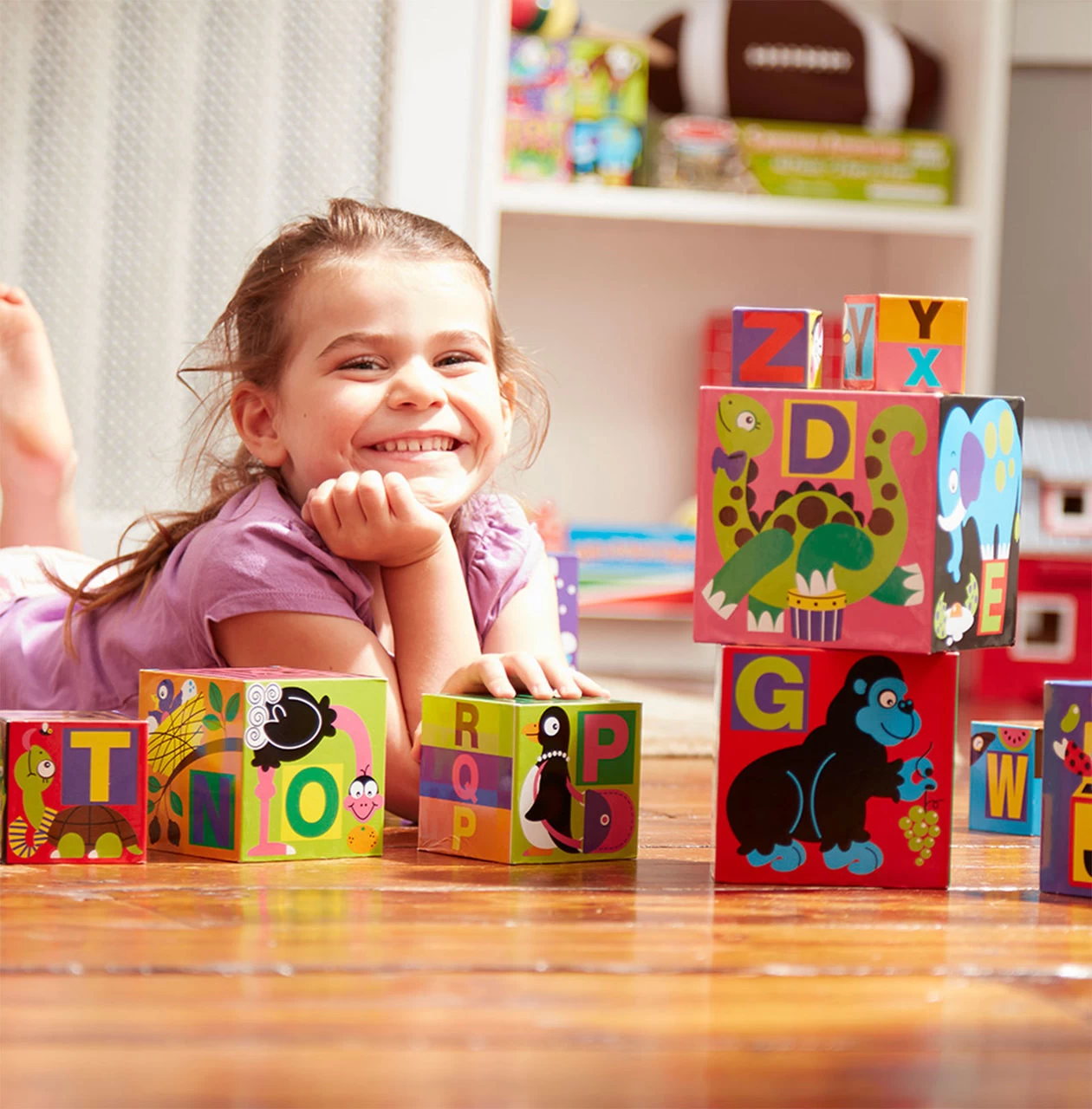 - Each block differs in size and features letters & familiar pictures