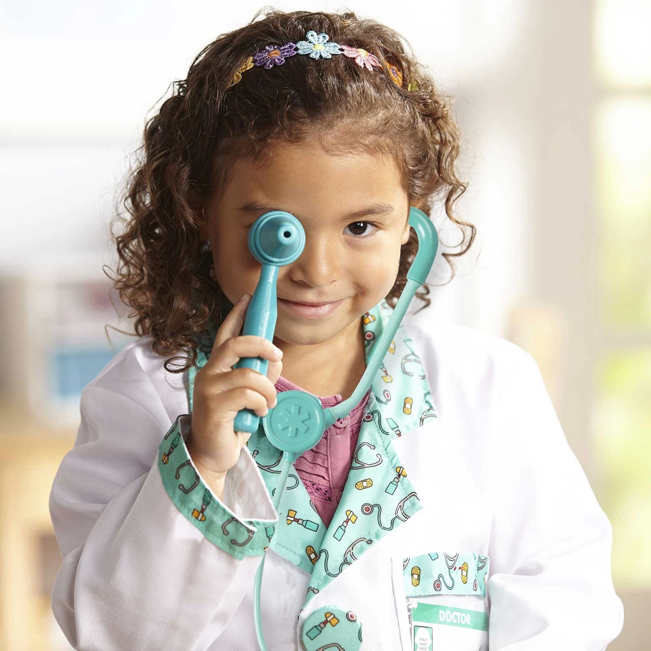 The doctor will see you now! With this Melissa & Doug Doctor Dress Up Costume Set of kids favourite outfits, your little medic will be fully equipped with a jacket and face mask, a stethoscope with sound effects, a reflex hammer, an ear scope, a syringe, and a name tag to personalise. Everything your kid needs to look the part, plus all the required tools to spur imaginative play, whether its playing doctor, vet or for book week.