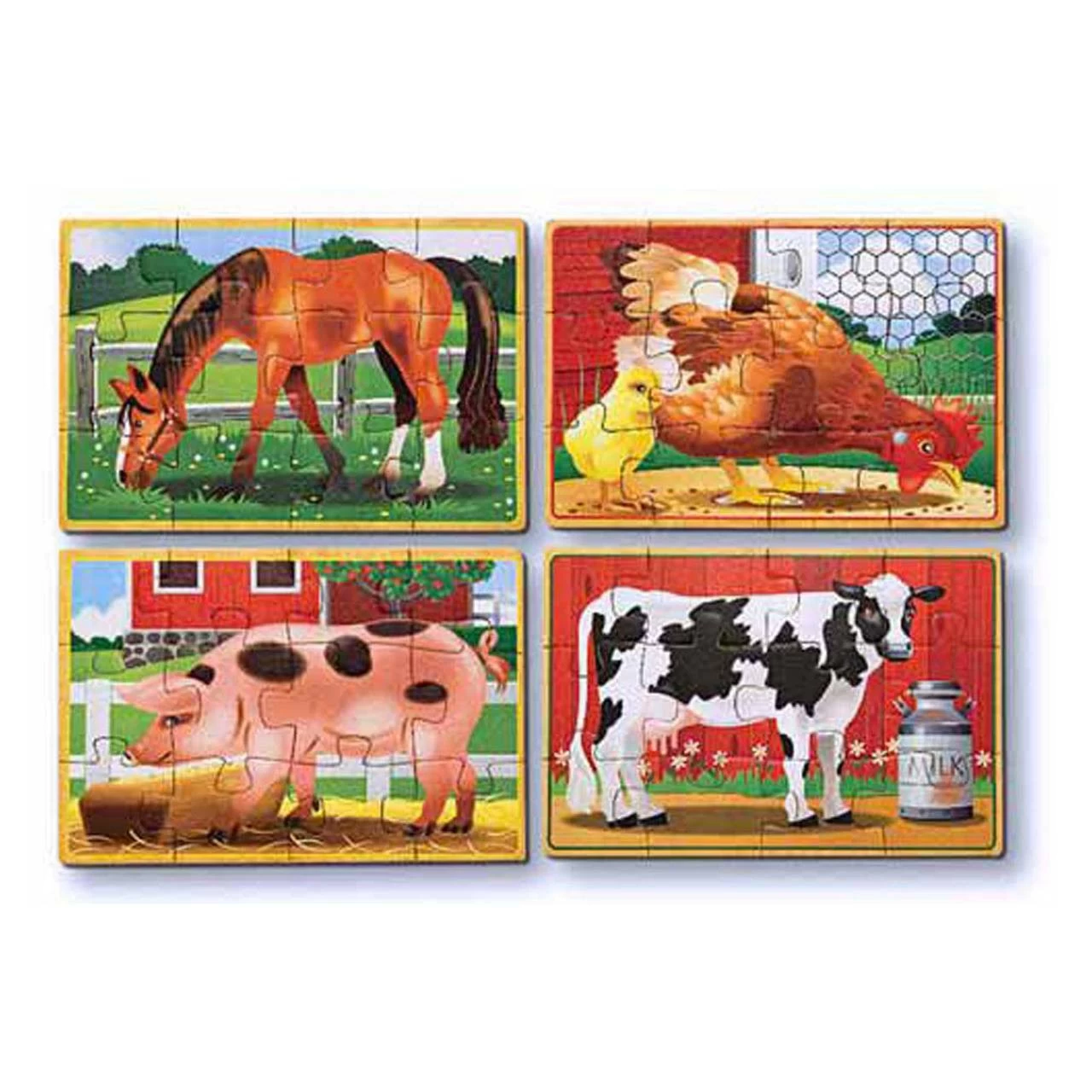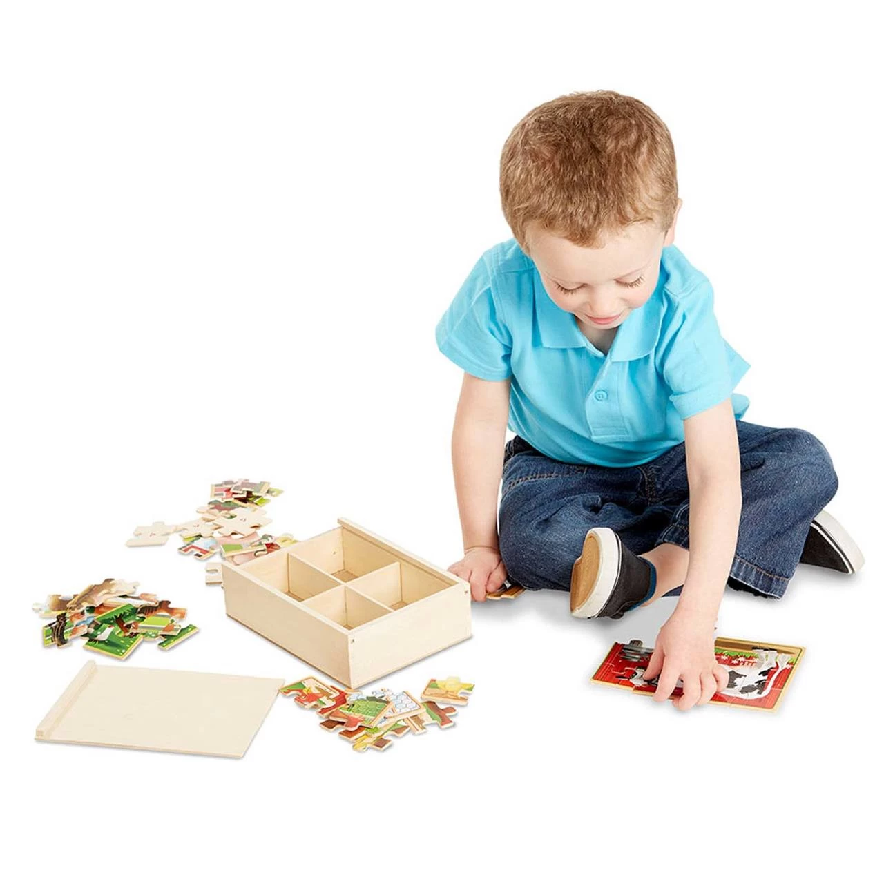 Enjoy these Melissa & Doug Jigsaw Puzzles In A Box while out and about or at home. These sets includes four wooden, 12-piece jigsaw puzzles. Each puzzle is stored in a separate compartment of a strong wooden box! The slide-on box lid doubles as a convenient puzzle board! Each puzzle piece is shape-coded on the back for easy sorting. It’s size makes for a great travel activity to occupy kids while promoting hand-eye coordination, fine motor skills, & problem solving. The farm set includes a hen and her chick, cow, a pig, and a horse
