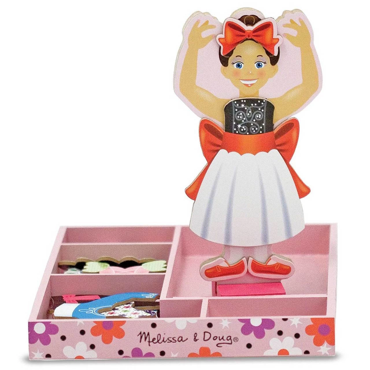 This Melissa & Doug Nina Ballerina Magnetic Dress-Up Set is a wooden doll with 6 Magnetic Outfits. Nina, prima ballerina is ready to perform with grace and beauty in practice tights or sparkly tutu. This set includes a magnetic wooden doll with a wooden stand and lots of colourful and attractive magnetic outfits and accessories for pretend play!