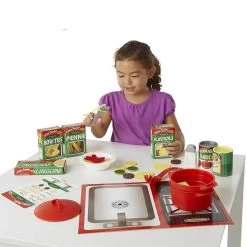 - 50+ piece –Â guide, spoon, pots, cans, jars, boxes with play food