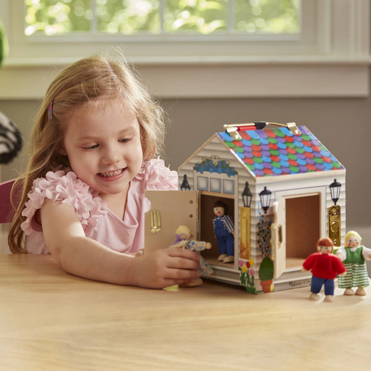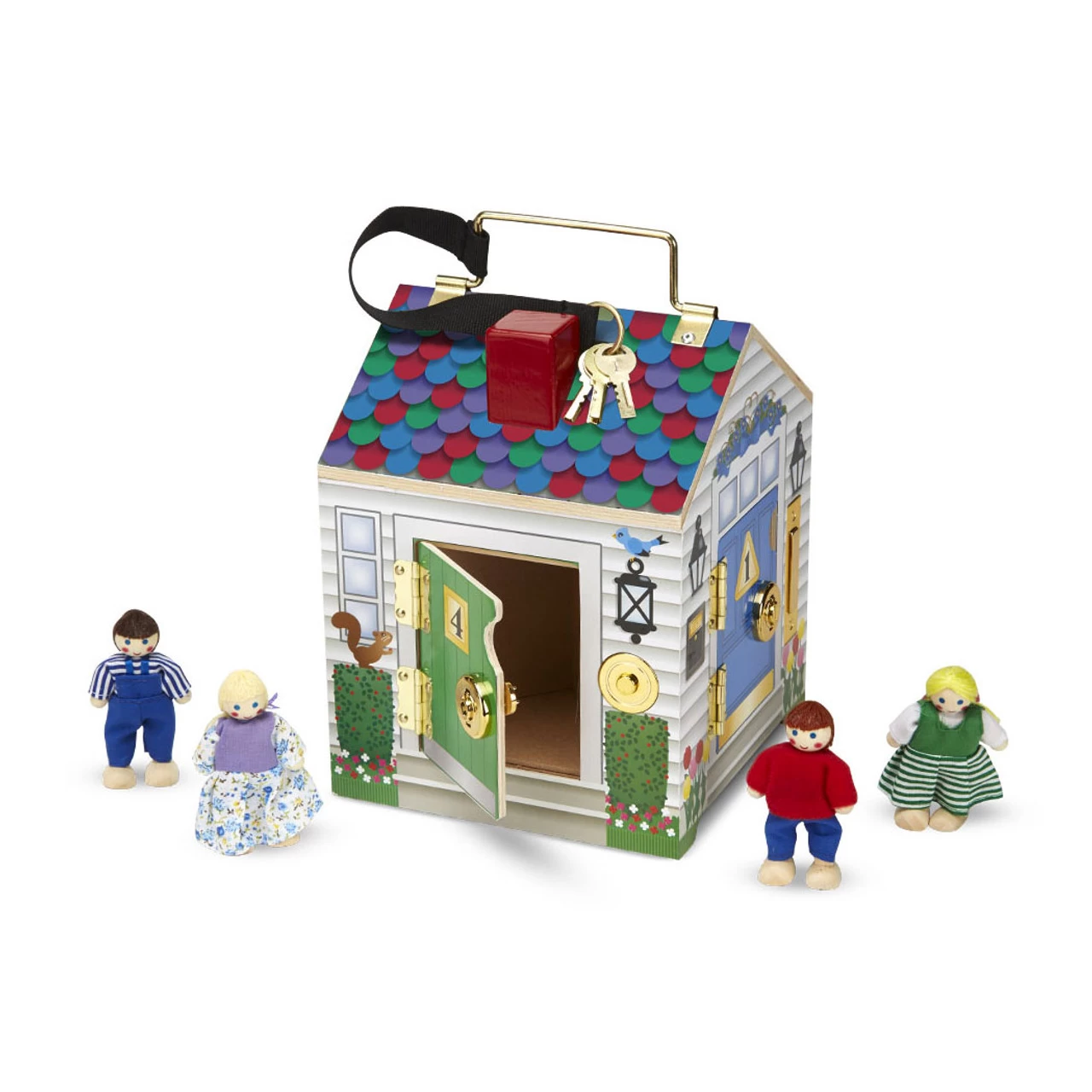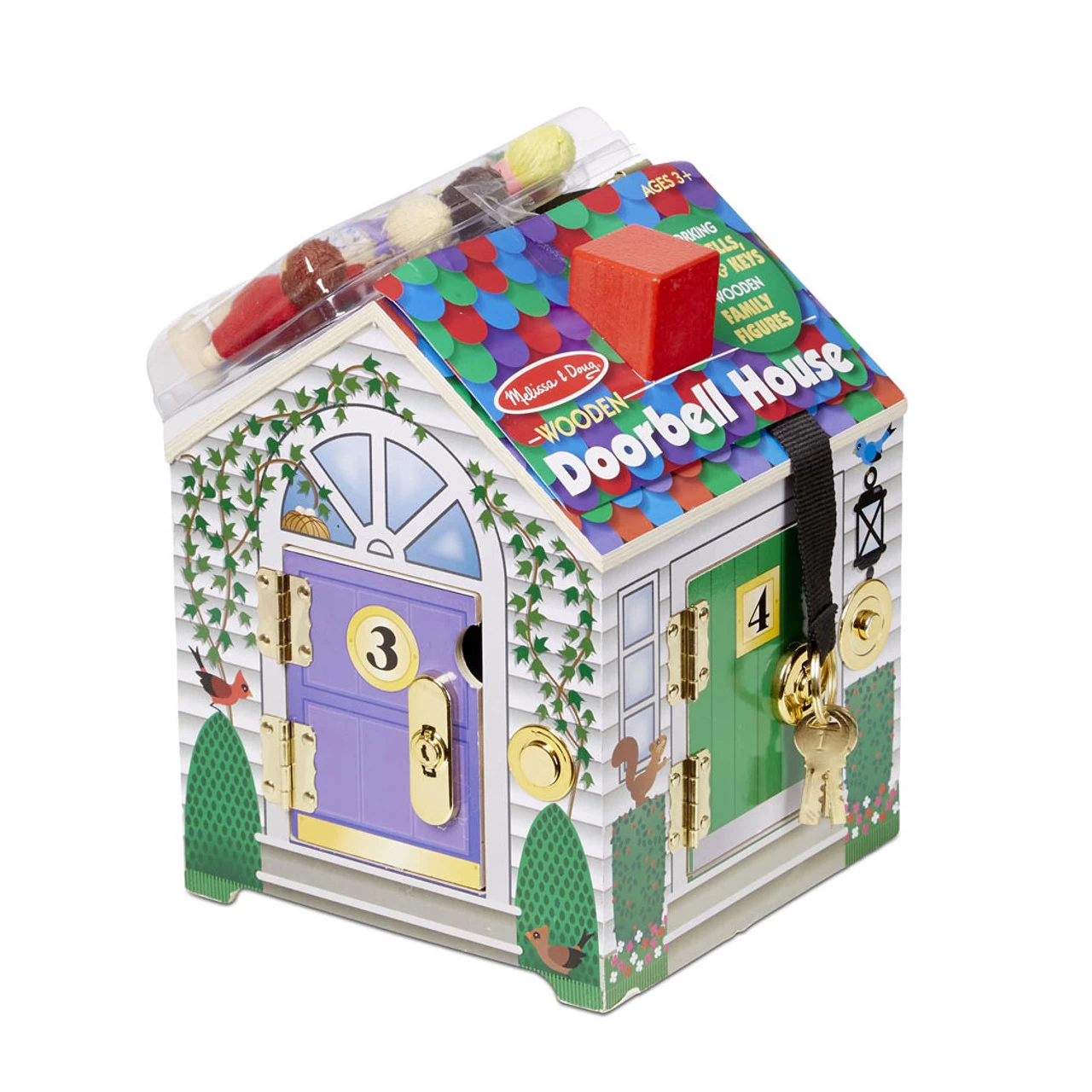 Ding-dong! Fun is at the door of this sturdily built Melissa & Doug Take-Along Wooden Doorbell House. With 4 electronic doorbell sounds, 4 unique locks with matching keys, and 4 play people, this charming cottage is sure to become a playtime destination. Plus, the keys are attached to the house so they won”t get lost, and the sturdy handle allows children to take this exciting house party wherever they go!