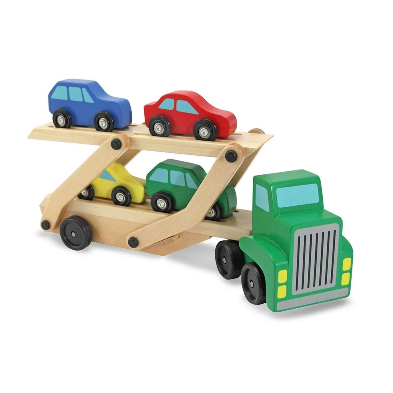 This fantastic truck picks up and delivers four colourful cars with this Wooden Car Carrier Truck set. Its upper level lowers to let the cars drive on, then lifts smoothly to hold two of the cars when it’s time to roll out. With 4 cars in red, blue, yellow and green, kids can naturally be sorting, sequencing and grouping, as well as building important cognitive skills too. Lil’ car fans will love this classic toy.Â