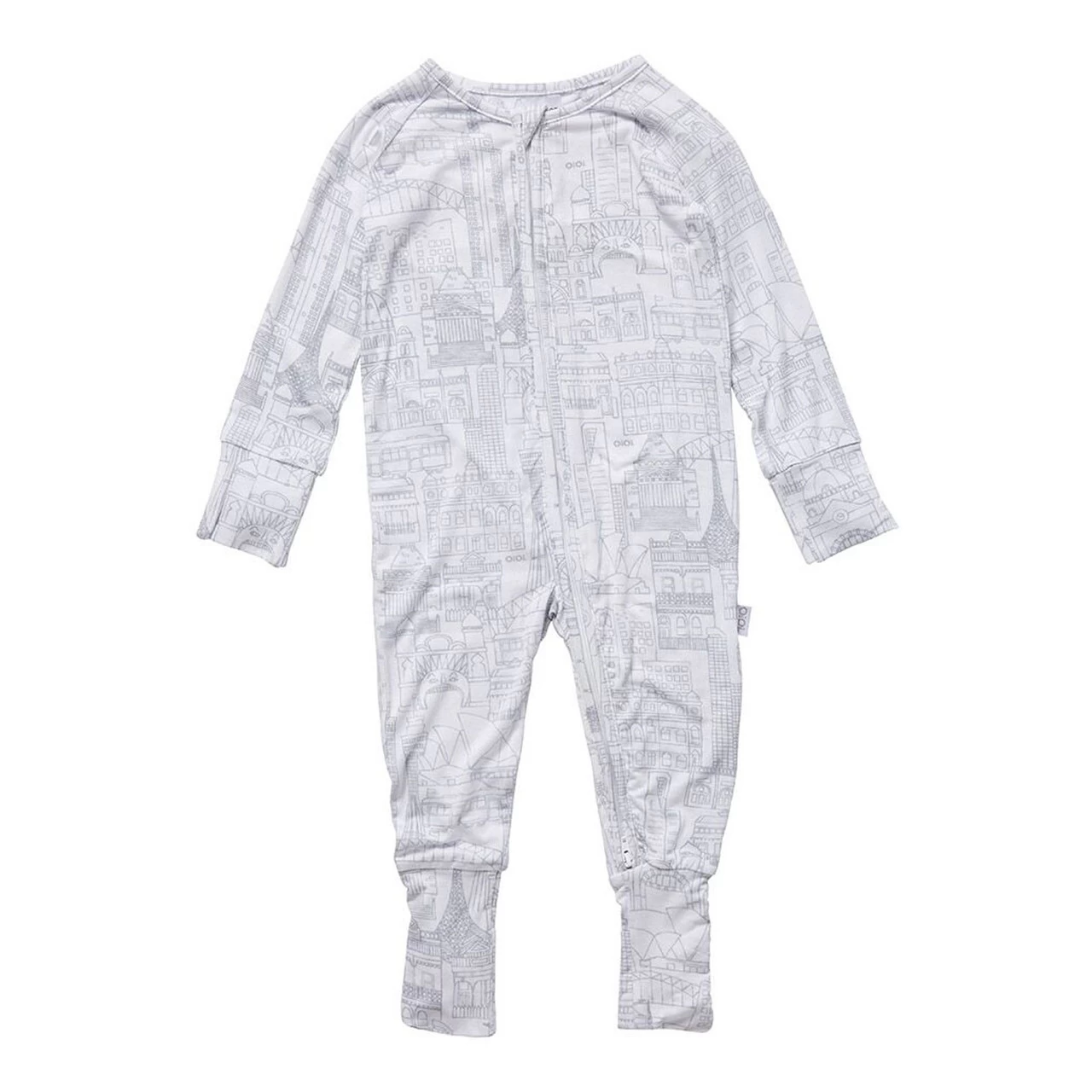 OiOi Bamboo Long Sleeve Zipper Romper – Cityscape. Made from buttery-soft rayon from Bamboo, this romper is so comfortable and gentle on your baby’s delicate skin. Features buildings inspired by the Australian urban landscape, this signature Cityscape print is a popular go-to pattern for the Aussie-themed unisex baby gift.