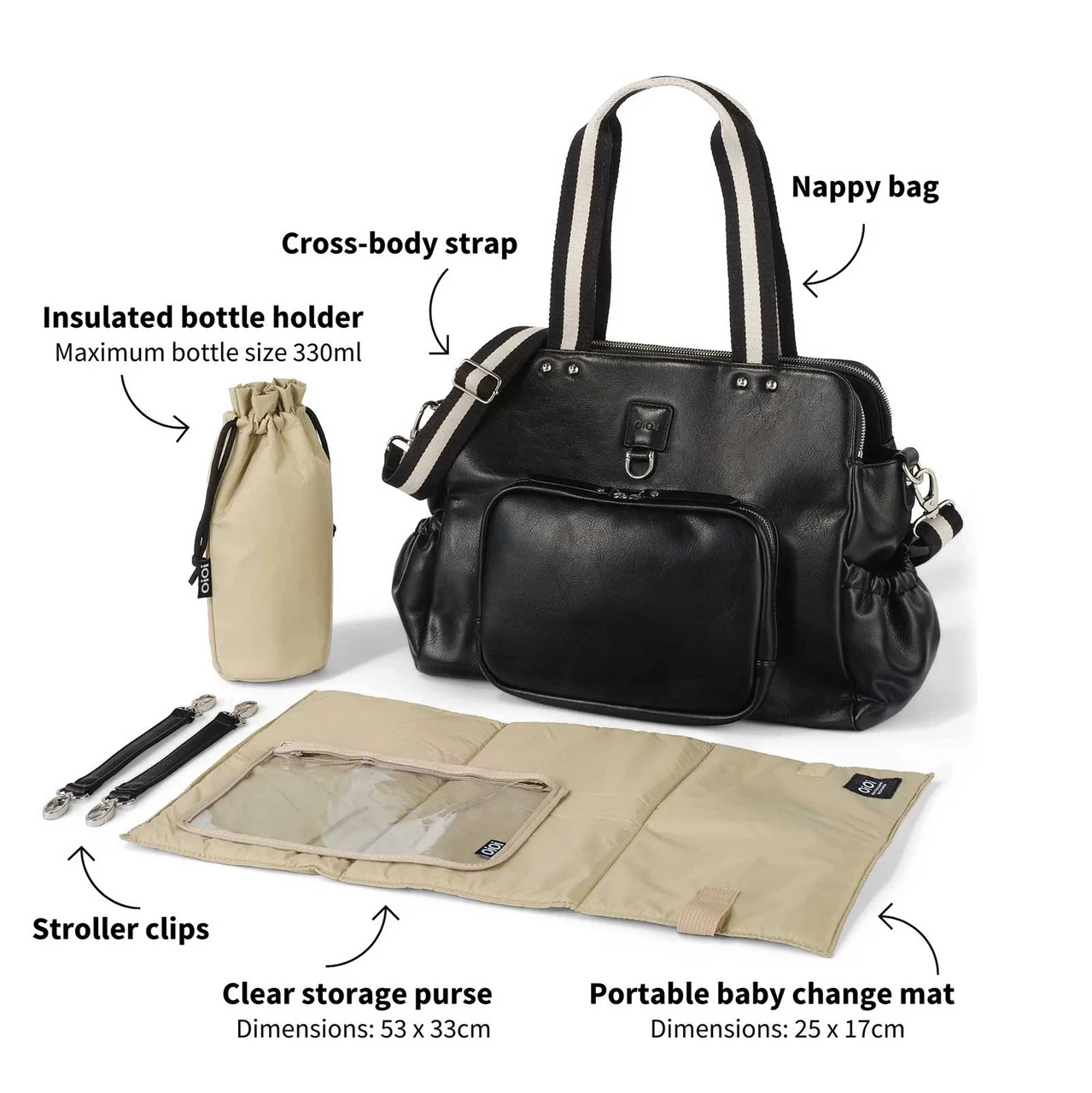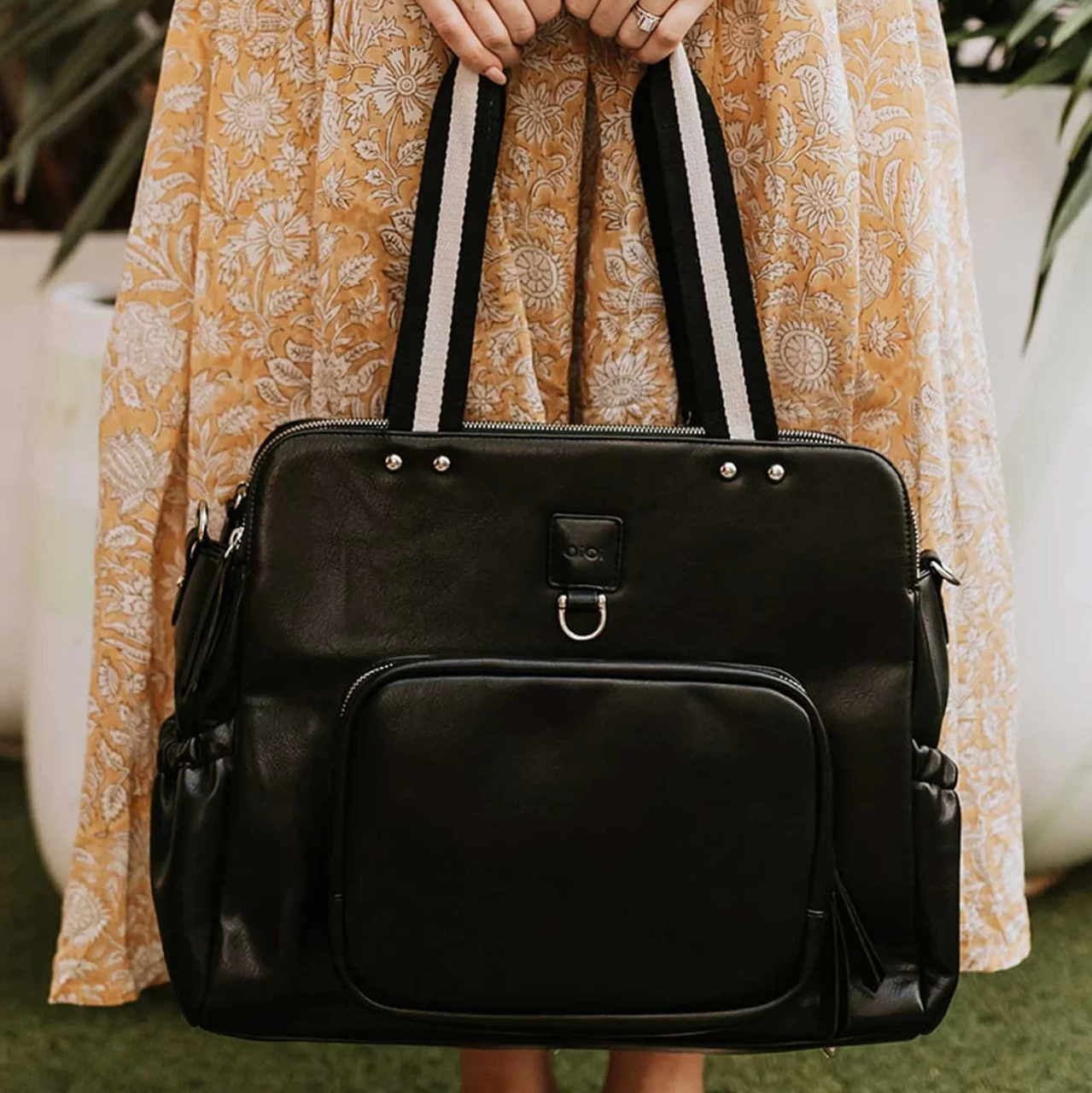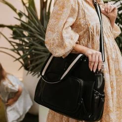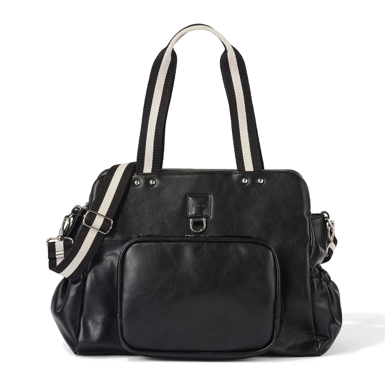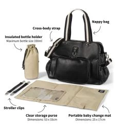Meet the Black version of the OiOi Tote Triple Compartment Nappy Bag. Made from premium faux leather with a water resistant finish, this baby bag has two deep zip compartments divided by a large open section which includes elasticised and zip pockets. Inside this diaper bag, you’ll find a cushioned, easy-to-clean changing pad, along with an insulated bottle holder and zip top plastic bag for dirties.Â
