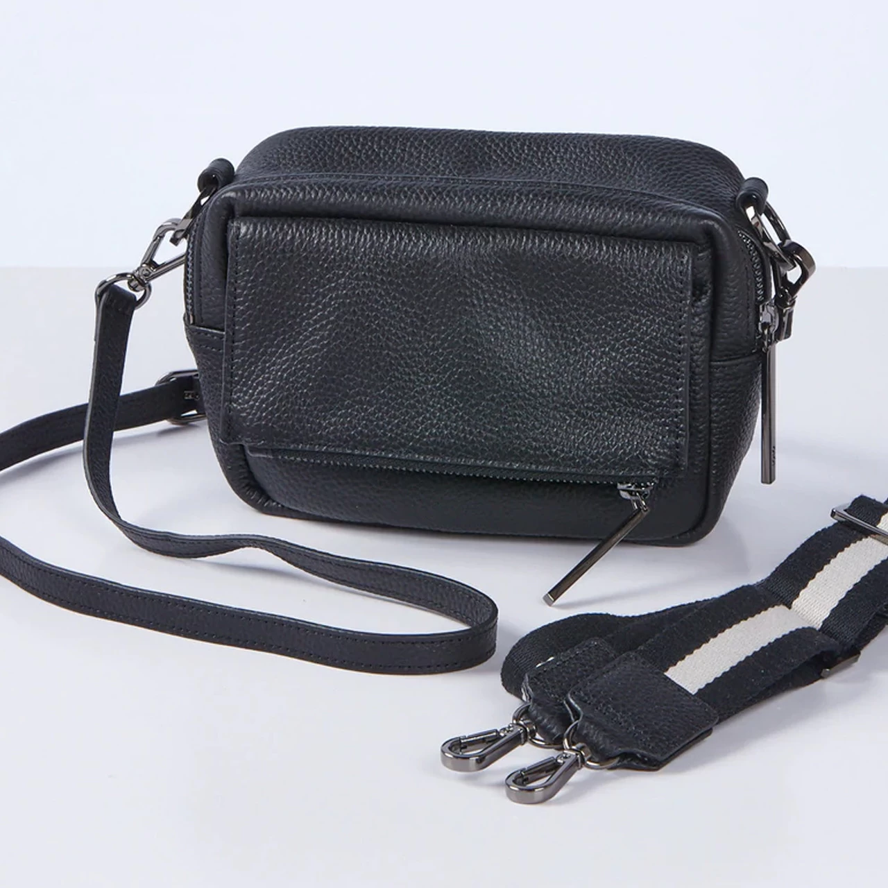 - The Everyday Strap: Wide Black/White Canvas Strap with Jet Black Leather Trim (adjustable 75cm to 120cm)