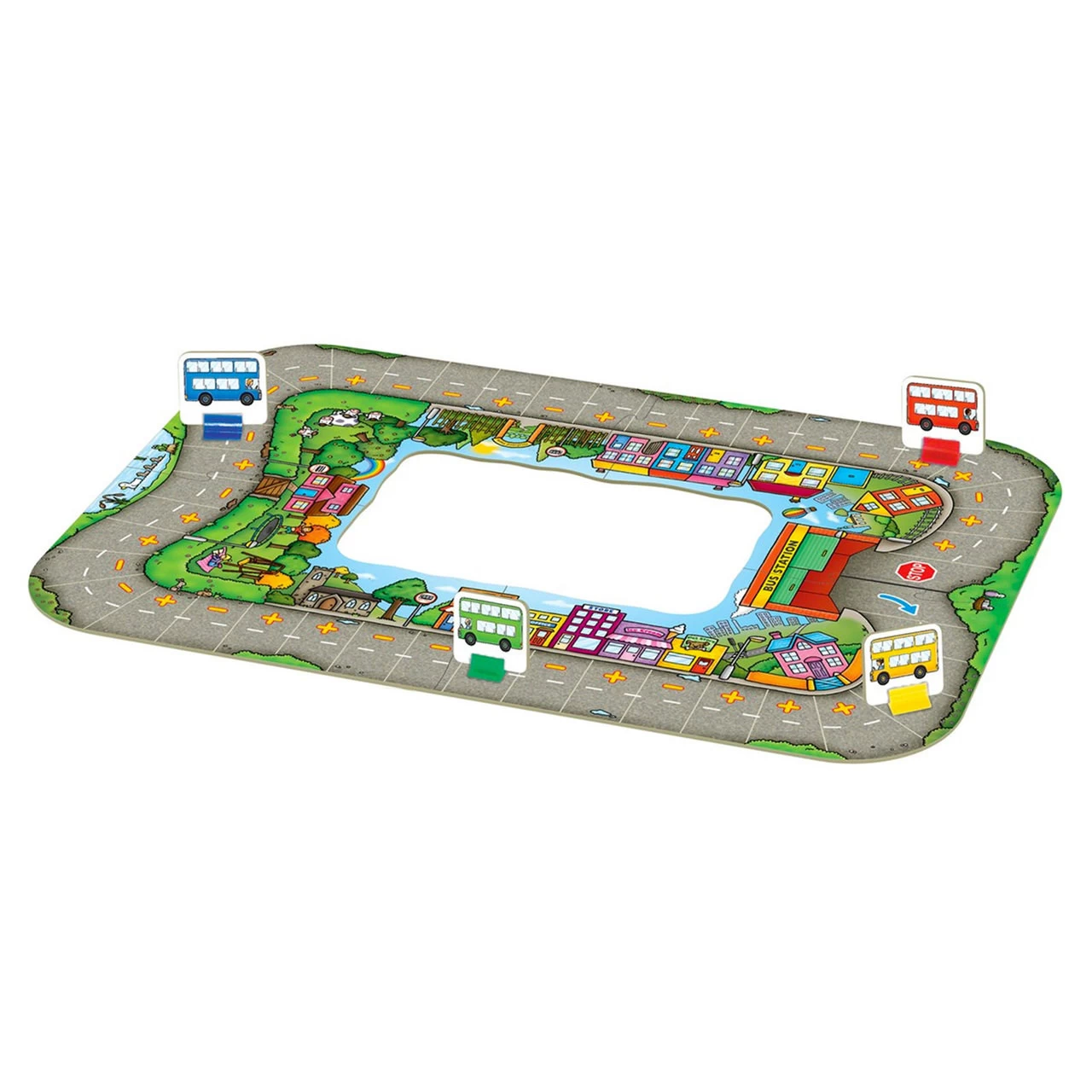 This Orchard Toys Bus Stop Game is a colourful & fun addition and subtraction game. Get the kids excited about learning to add and subtract with this classic educational game. Race to the bus station, picking up and dropping off passengers! The winner is the player with the most passengers when their coloured bus finally arrives at the bus station! Simply throw the dice to move your bus around the board, either landing on a plus or minus square. Players spin the spinner to see how many passengers to count on or off their bus.Â