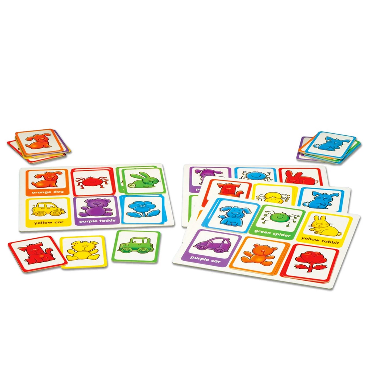 The game features a variety of colours for children to learn and match, including red, blue, purple, green, orange and yellow. When playing with younger and older children, encourage older children to read the words of the colours aloud as well as matching the cards by colour and shape for an extra challenge.