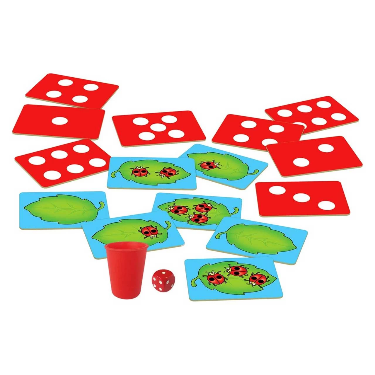 Children will learn to count as they match the spots and collect cute ladybirds in this Orchard Toys The Game of Ladybird! Players must roll the dice, match the spots on the cards to the ones on the dice and count the ladybirds hiding on the leaves. This simple game uses a classic cup and dice, which children will enjoy as they take their turn! The player with the most ladybirds at the end of the game is the winner.