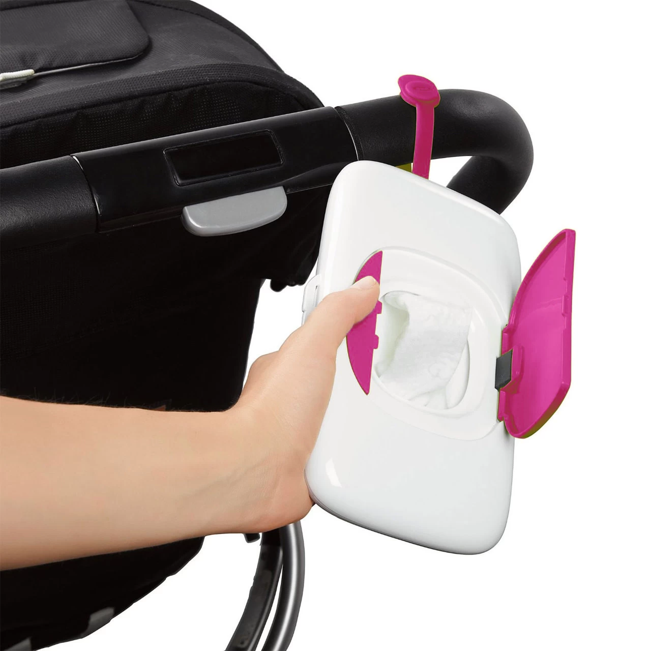 Store baby wipes fresh and accessible when out and about with this slim pink OXO On-The-Go wipes dispenser. Whether it’s diaper changes or a clean-up after a big brunch with mummy, wipes are always needed at a moment’s notice. A handy strap secures it to your diaper bag or pram,so you can always have it with you. With a simple, one-handed push of the button, you have easy access to a large opening that dispenses one wipe at a time. Bonus Tip : When your baby is (finally!) potty trained, use the wipes dispenser to keep wipes at the ready for messy hands & faces during snack time on the go.
