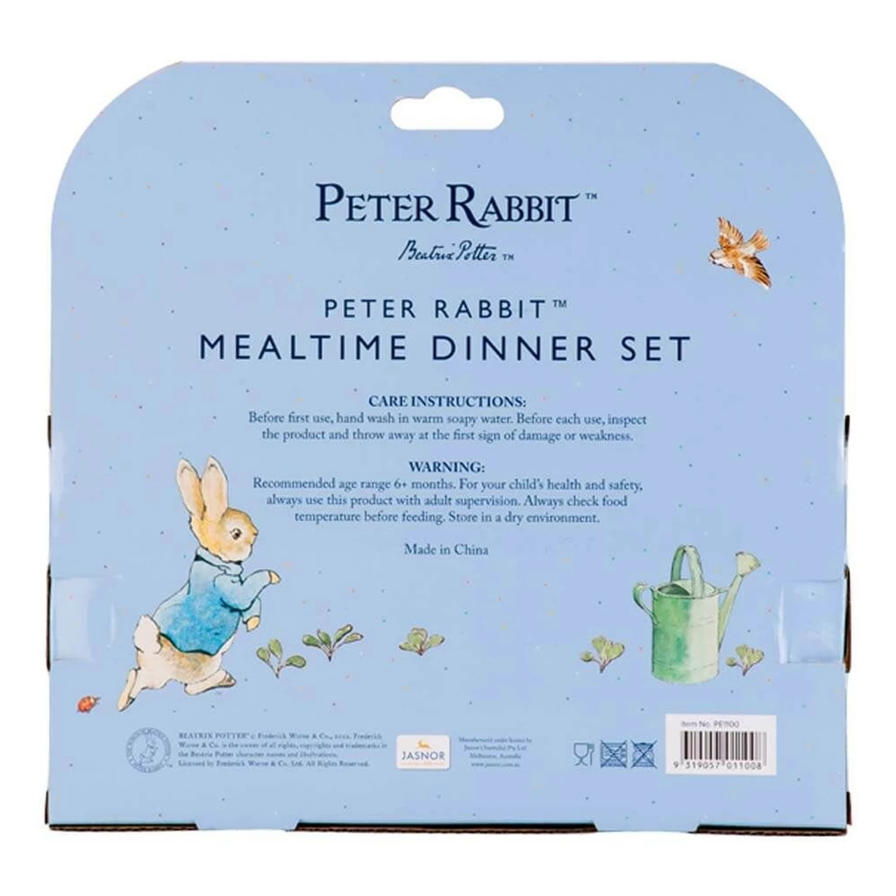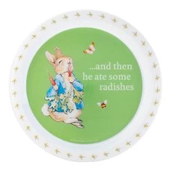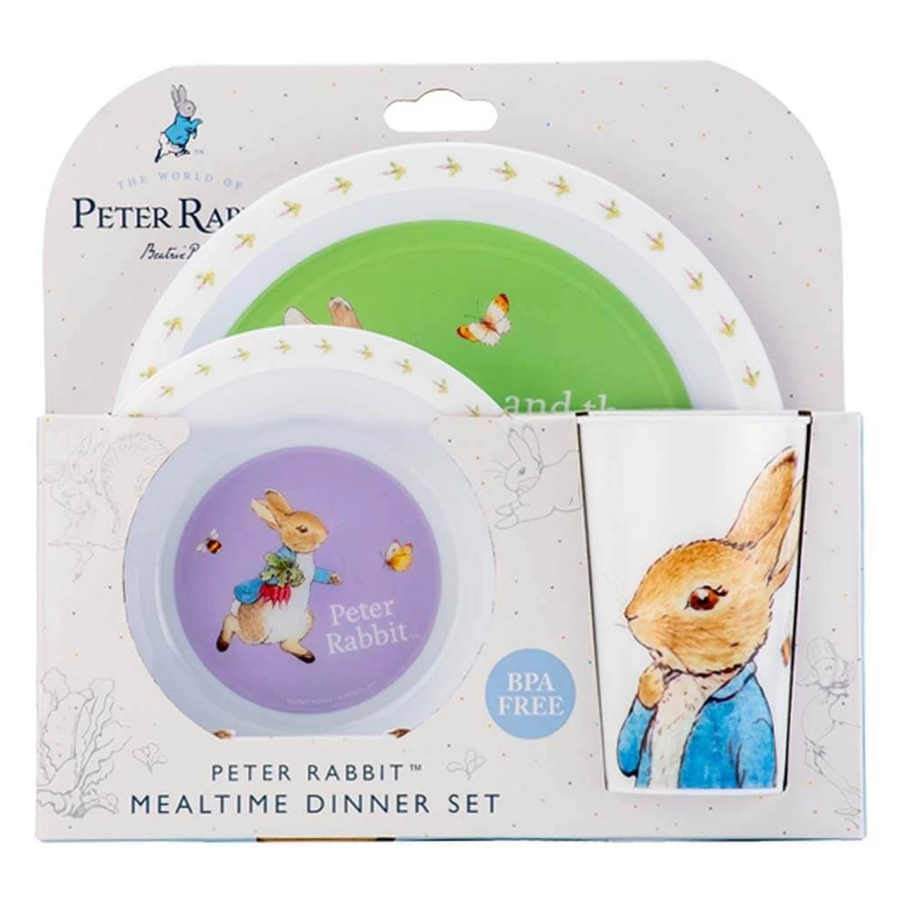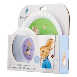 Add some whimsy to mealtimes with this adorable 3-piece dinner set, which includes a dinner plate, bowl and drink cup. Featuring a soft pastel design inspired by the world of Beatrix Potter, little ones will want to eat up so they can see their favourite bunny underneath! This set is a beautiful gift for any boy or girl.Â
