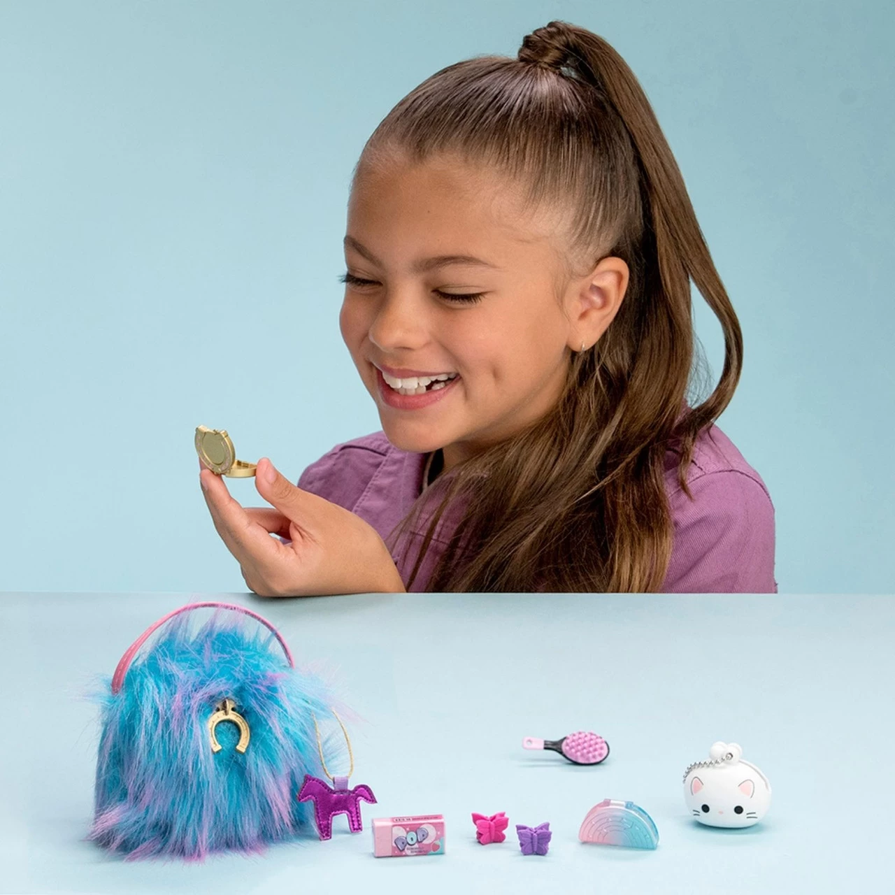 “What’s in my bag?” The answer to that question will be revealed when you discover the cutest tiny surprises inside your Real Little Handbags! Small but so stylish, these designer Handbags are full of mini essentials that every girl needs to get through their day! In every bag you will find 6 surprises. Open up your bag to find items like a mini Pen, a mini Magazine, a tiny Coin Purse, a little Lip Gloss, the cutest Compacts, mini Hair Brush, Hair Clips, Bag Charm and even a tiny Water Bottle! There is also a chance to find a Limited Edition Ring Watch!