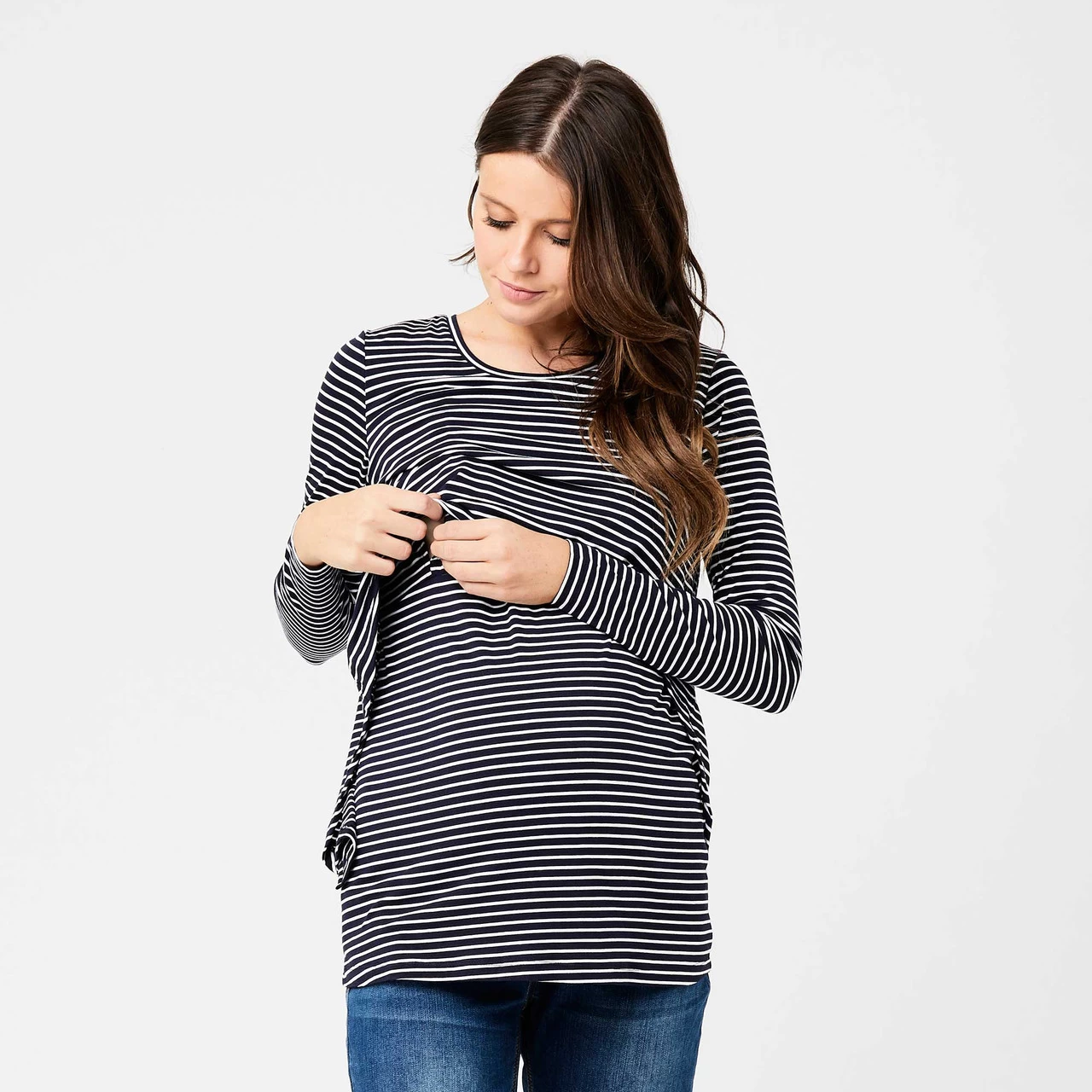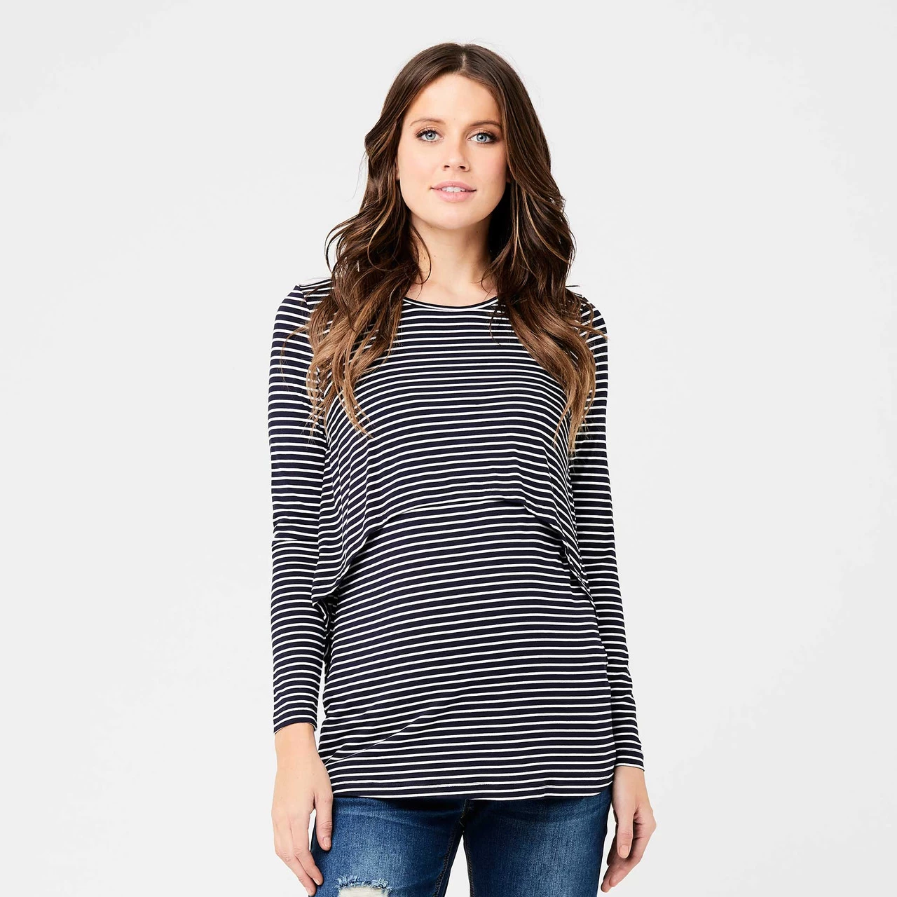 The Ripe Maternity Stripe Swing Back Nursing Top will be your go-to weekend tee during pregnancy and beyond. The classic black and white yarn dyed stripe will fit seamlessly into your new wardrobe. Post pregnancy, the clever ‘up/down’ nursing access will help make discreet nursing a breeze.Â