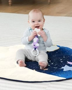 Filled with a galaxy of fun for baby, this dreamy Skip Hop Celestial Dreams Baby Activity Gym features a celestial-themed playmat with plush quilting details and a crescent moon pillow for tummy time play. A removable shooting star baby mirror encourages self-recognition, while five nighttime friends engage your little one’s senses with music, sounds, textures and more to explore.