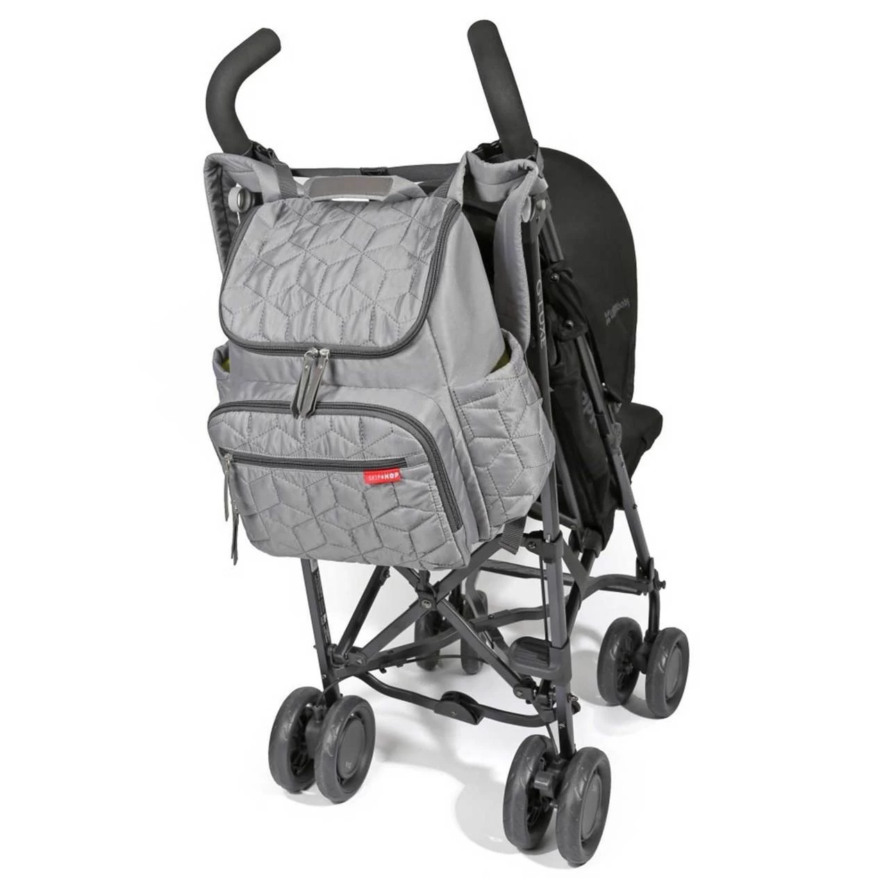 This stylish, water resistant, grey feather Skip Hop Forma Diaper BackpackĀ is made of a lightweight fabric and quilted detailing, while offering the convenience of hands free parenting while travelling. This patterned spacious bag can room everything from spare clothes to snack and bottles. The convenient front zip pocket holds one matching mesh packing cube and one trendy patterned insulated cube, which is perfect for bottles, sippy cups, or snacks. Everything stays in place and within reach with elasticised interior pockets and insulated side bottle pockets. The changing pad pocket performs double-duty, serving as a laptop holder when out and about. The Forma backpack is the ultimate in pack and go organisation for any mother. Have everything at hand when youāre out and about, designed to work from infancy to toddlerhood and beyond.