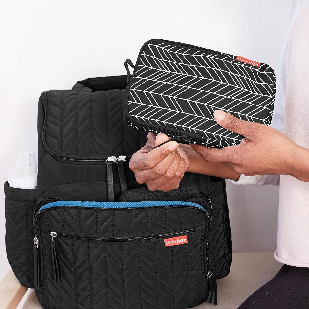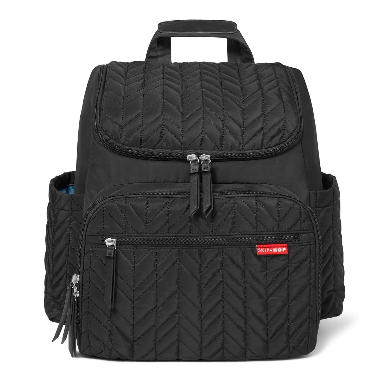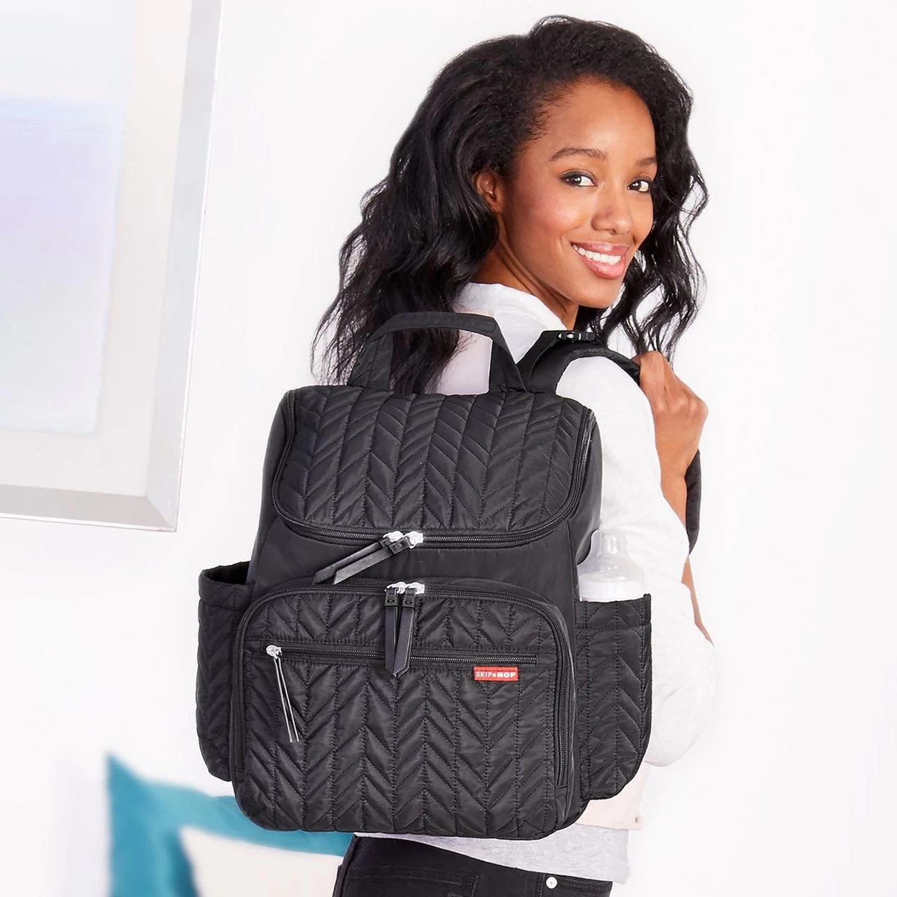 Meet the New Skip Hop Forma Diaper Backpack in Black (with a new quilted print design.) This stylish, water resistant backpack is made of a lightweight fabric and quilted detailing, while offering the convenience of hands free parenting while travelling. This spacious bag can room everything from spare clothes to snack and bottles. The convenient front zip pocket holds one matching mesh packing cube and one trendy patterned insulated cube, which is perfect for bottles, sippy cups, or snacks. Everything stays in place and within reach with elasticised interior pockets and insulated side bottle pockets. The changing pad pocket performs double-duty, serving as a laptop holder when out and about. The Forma backpack is the ultimate in pack and go organisation for any mother. Have everything at hand when you’re out and about, designed to work from infancy to toddlerhood and beyond.
