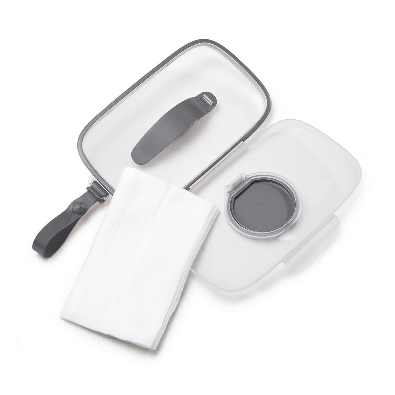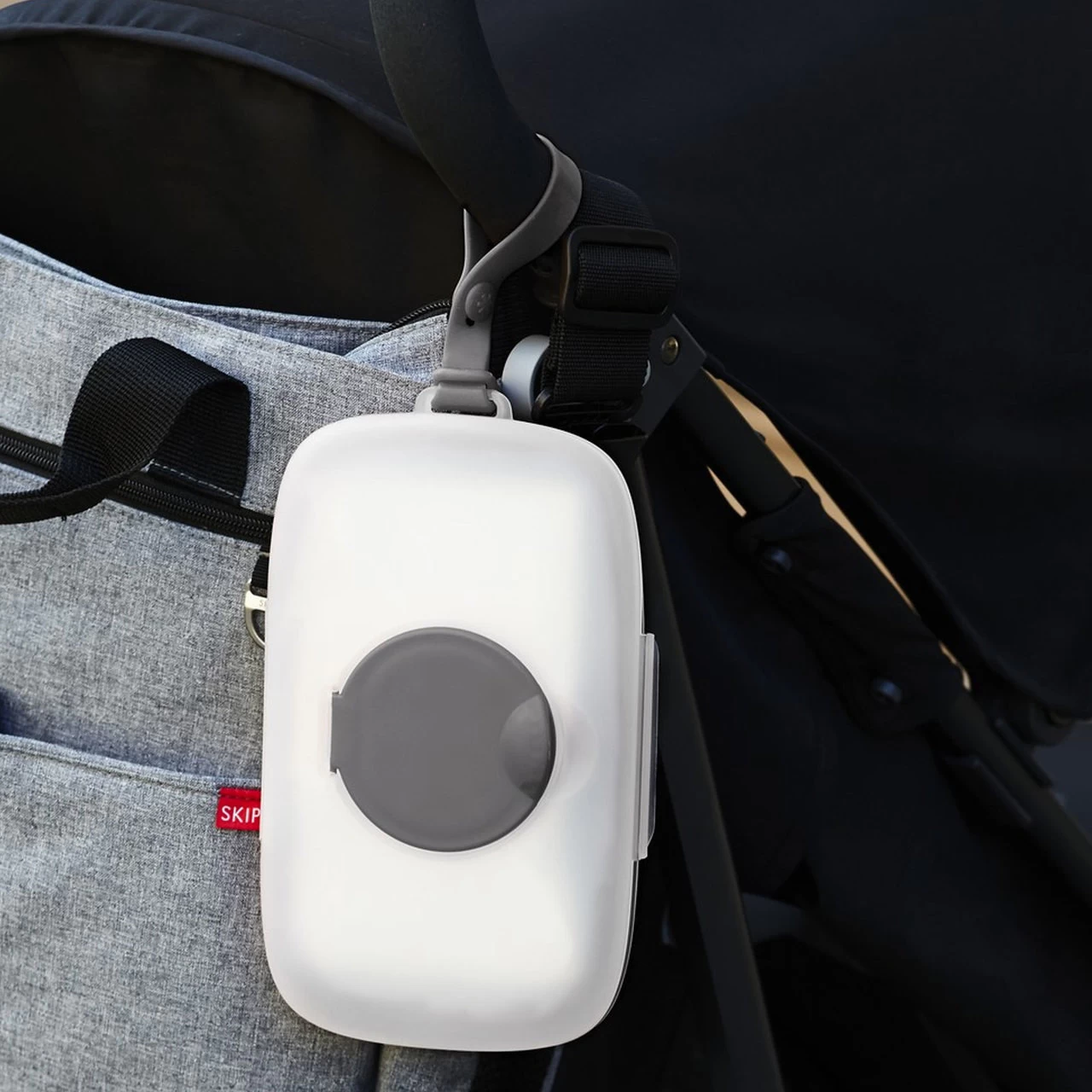 Store baby wipes fresh and accessible when out and about with this slim grey Skip Hop Grab & Go Perfect Seal Wipes Case. Whether it’s diaper changes or a clean-up after a big brunch with mummy, wipes are always needed at a moment’s notice. A handy strap secures it to your diaper bag or pram, so you can always have it with you. With a secure, wide opening and a moisture-stay seal, your baby wipes case is the answer to fresh wipes every time. Whether you drop it in your diaper bag or use the built-in strap to hang it on your stroller, it’s the perfect, stylish solution.