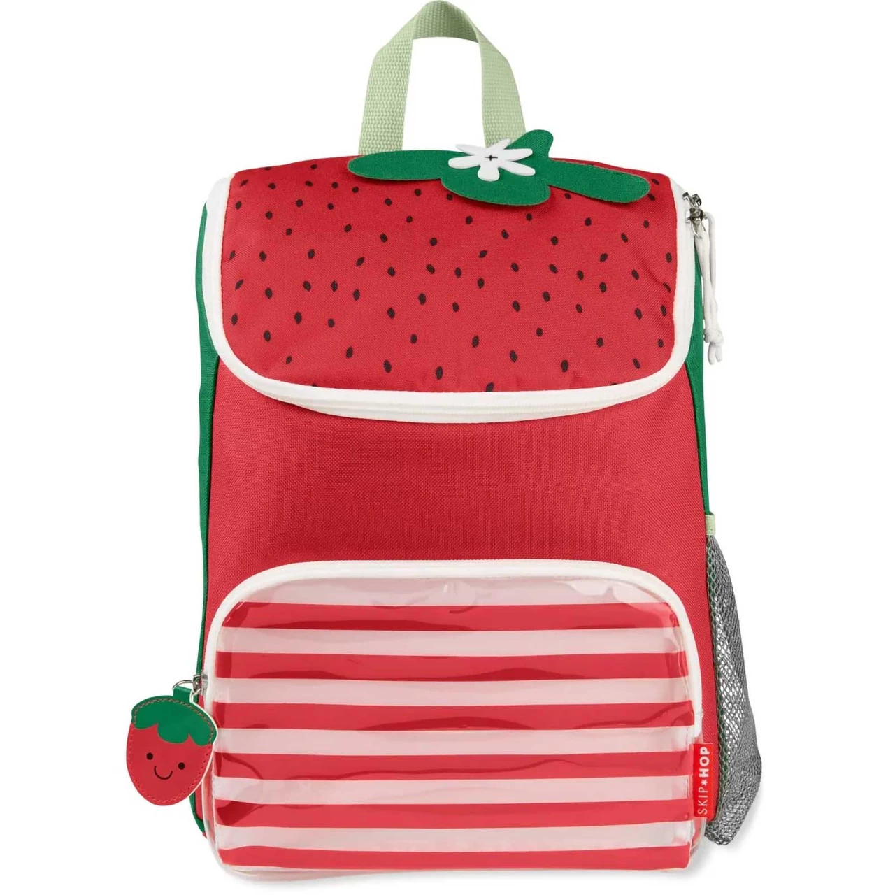 The Strawberry Skip Hop Spark Style Big Kid backpack is perfectly sized for those looking for a big more space than the classic Skip Hop kids backpack. This fruity, red backpack has a roomy main compartment with an easy-to-clean lining. Sized just right for school folders, supplies, a lunch bag, snacks in the insulated front pouch, and slip a juice box or drink bottle in the mesh side pocket. With adjustable, padded straps and even a clear front pocket, this Skip Hop bag is great for kinder, school or even turning into a library bag!