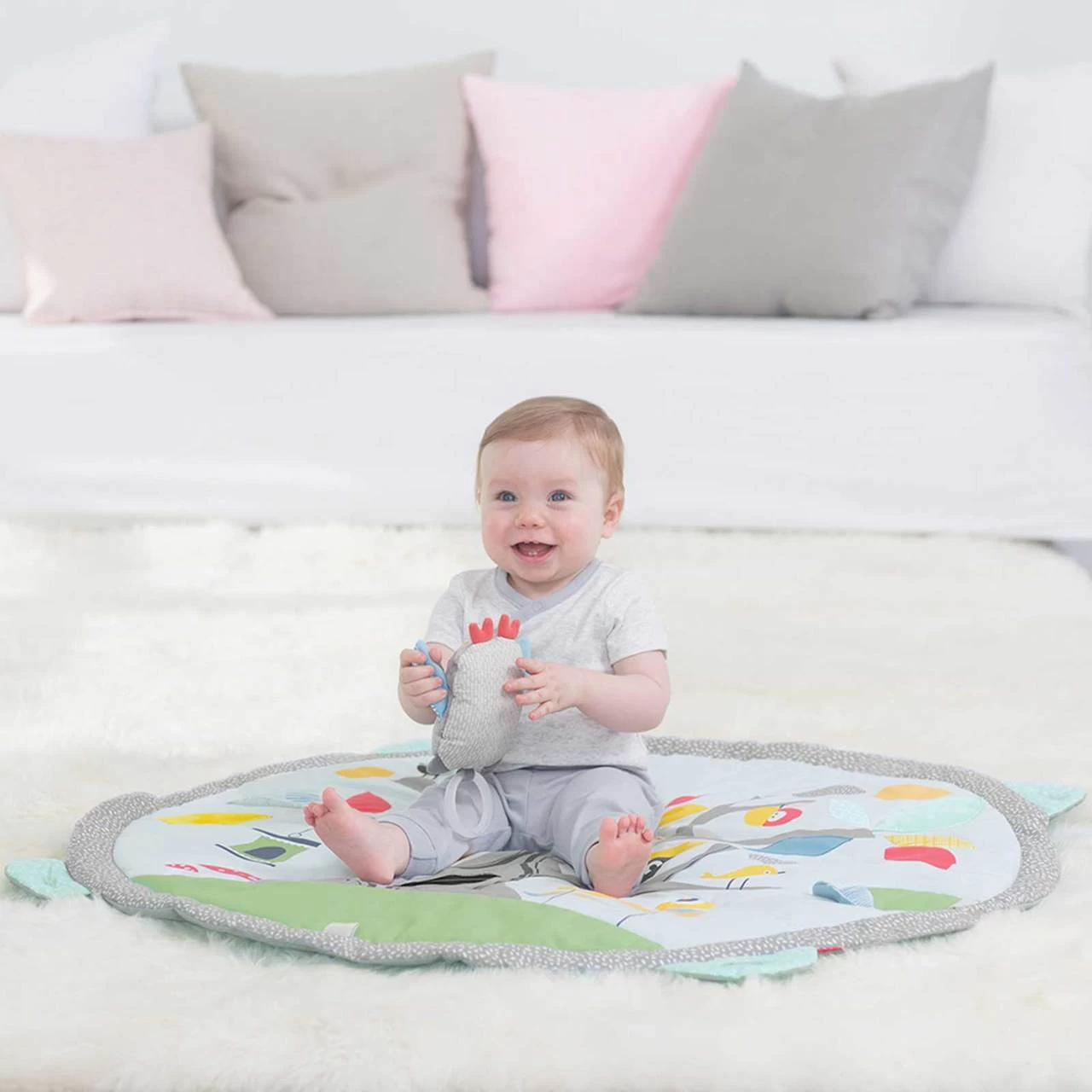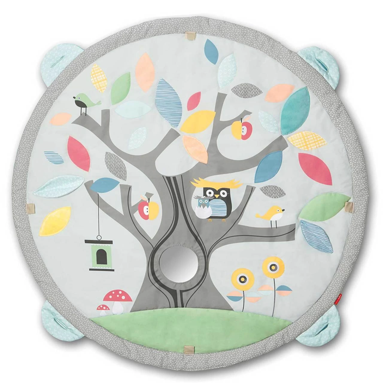 - Multiple fabrics plus activities on the mat: crinkle leaves, squeaker flower and baby-safe mirror in the tree trunk (mirror is removable for machine-washing)