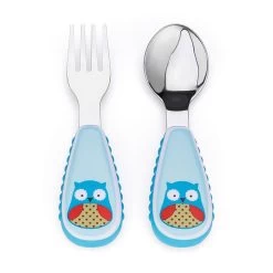 Get your toddler excited about using cutlery with this adorable Owl Skip Hop fork & spoon set. With soft side grips it’s easy for little ones to hold. Stainless steel heads make the utensils easy to use and just like a grown up! Metal fork head makes getting food onto the fork a whole lot easier than beginner plastic cutlery.