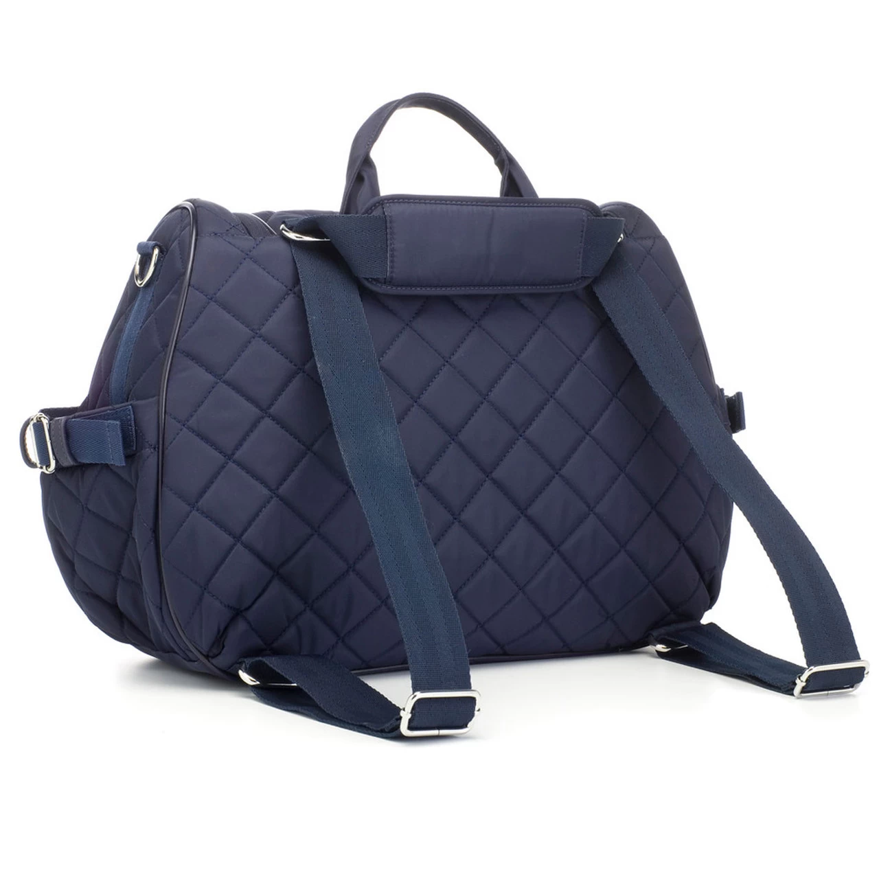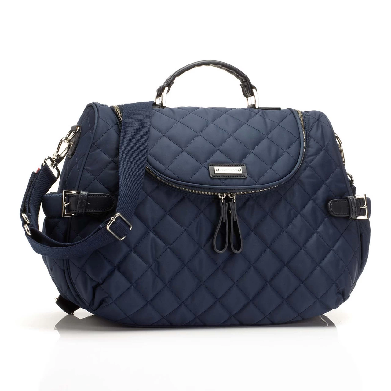 The latest addition to the Storksak range, meet the Navy Storksak Poppy Quilted Satchel Nappy Backpack. Crafted from durable, quilted nylon, accented by subtle hardware details adding an elegant touch to this functional design. Converting easily from a shoulder bag to backpack by pulling through nylon straps and done! Boasting supreme functionality with its wide opening into a roomy interior containing a multitude of pockets for easy access to your safely stored essentials and featuring a luxurious over-sized changing mat with pocket storage, insulated FAB bag and detachable stroller clips.