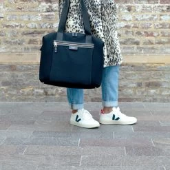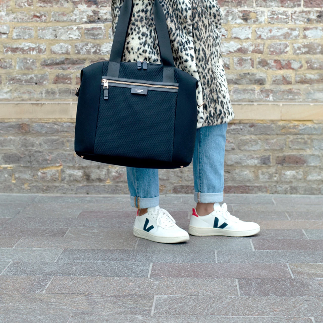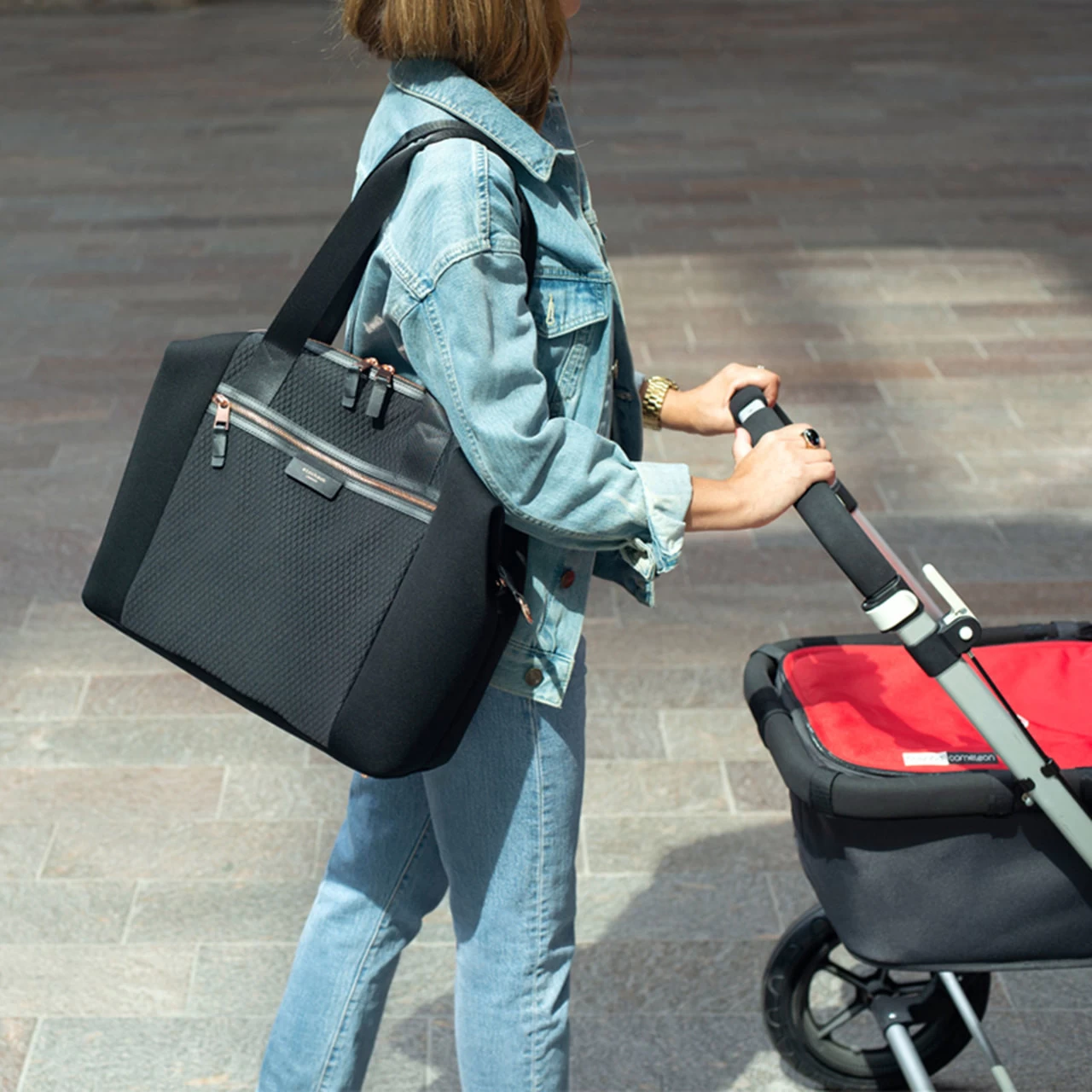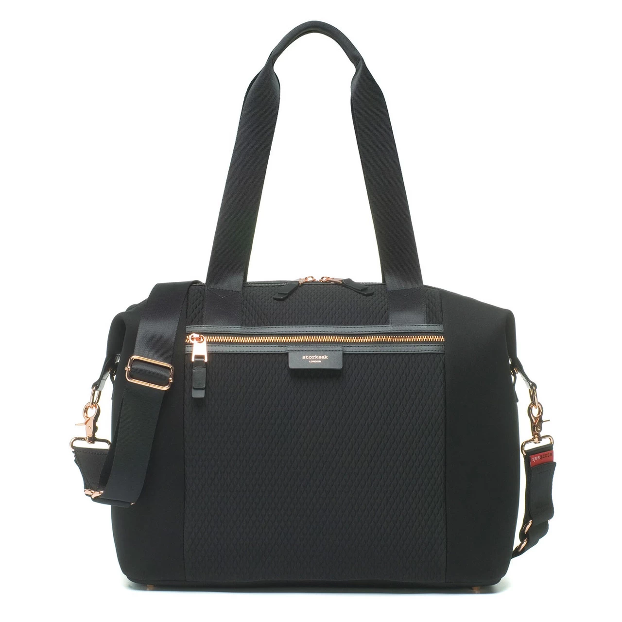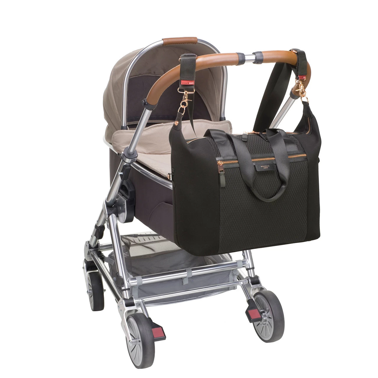 Defined by its technical scuba shell with emboss front panel, accented by smooth leather trims and statement rose gold hardware details. The Storksak Stevie Luxe is perfectly proportioned, with adjustable side tabs to alter the size and look instantly. A wide opening into a spacious interior with multiple pockets for easy access to your safely stored essentials. Featuring a luxurious over-sized changing mat with pocket storage, insulated FAB bag and long detachable strap with integrated patented stroller straps.