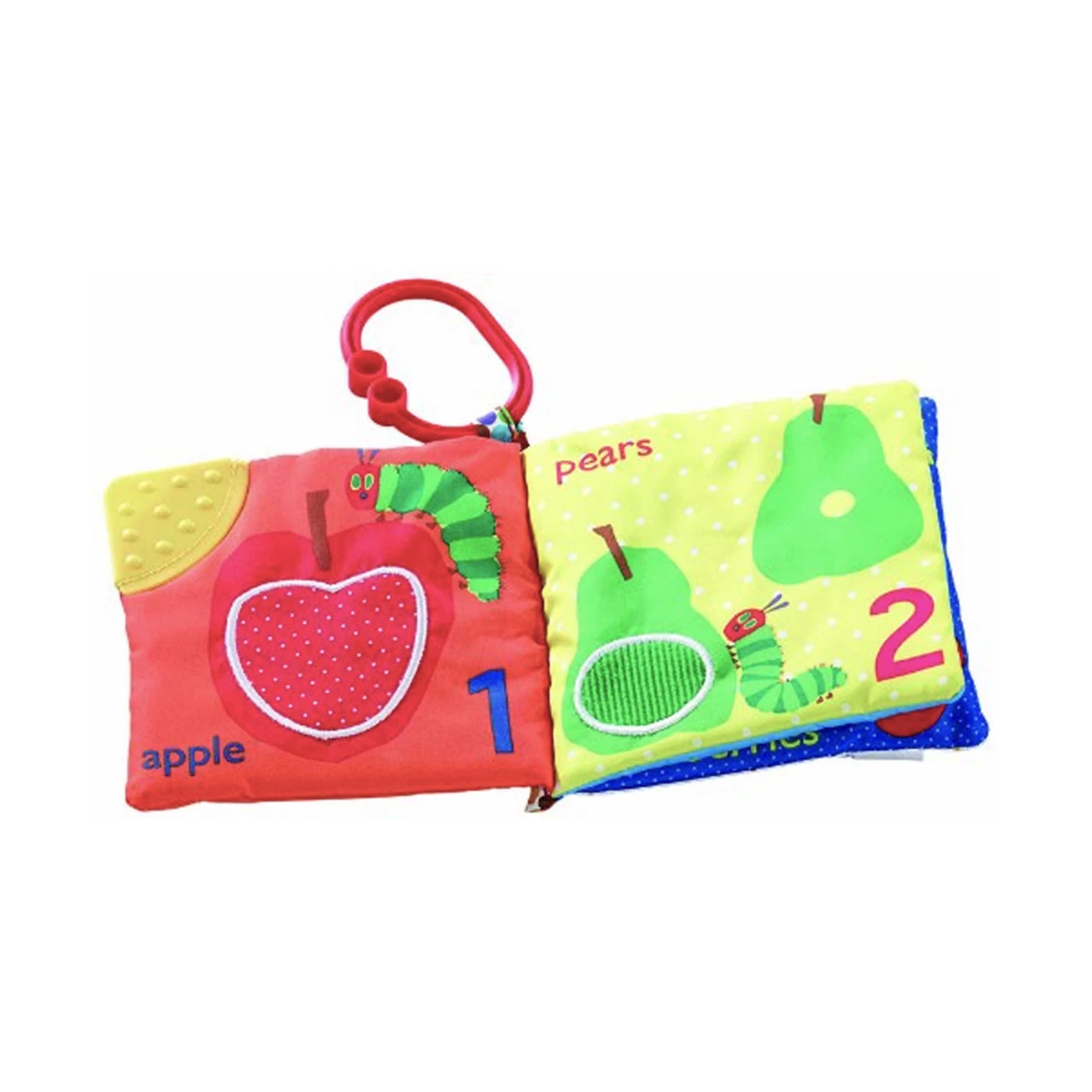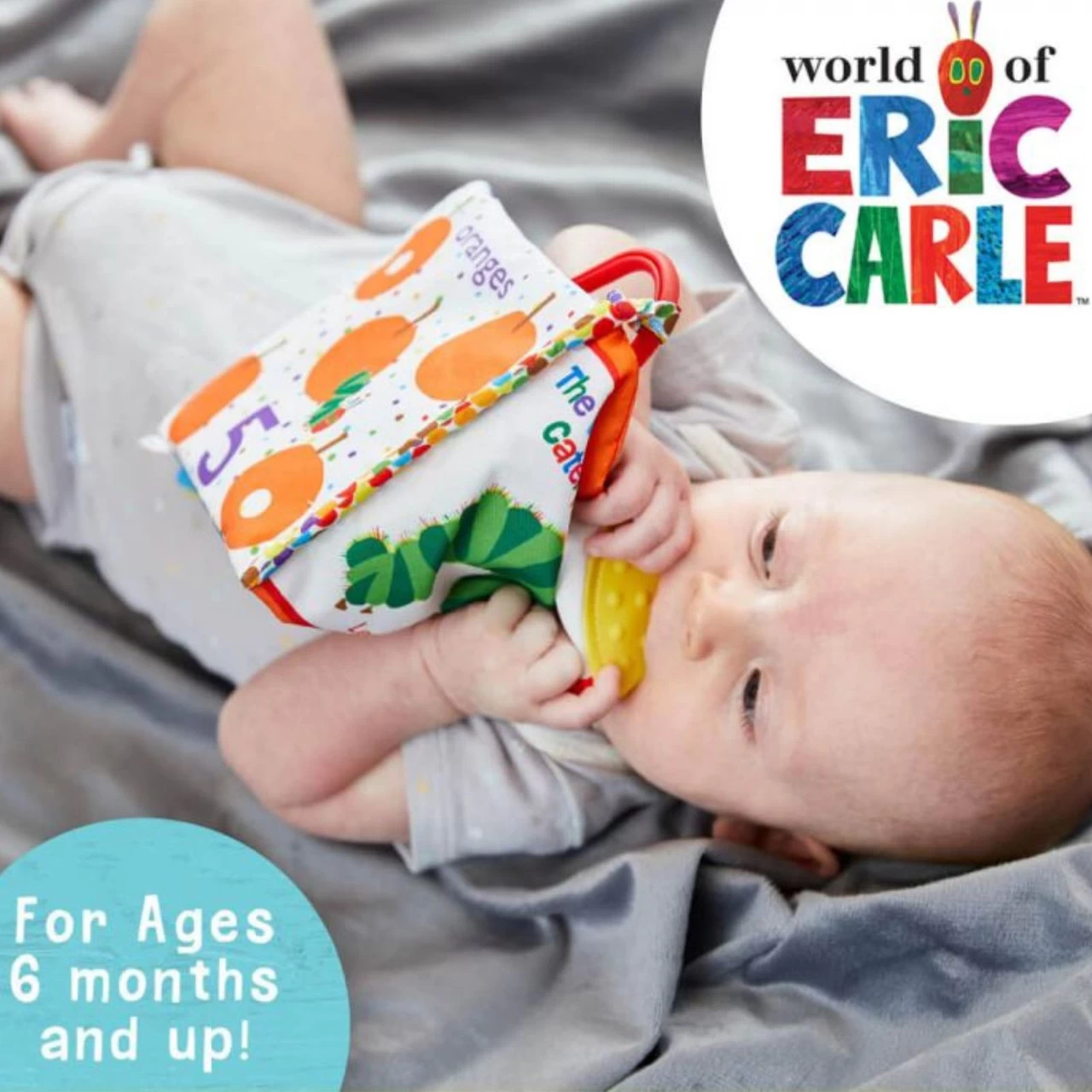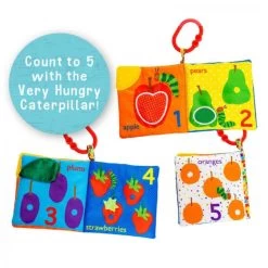 The timeless classic Very Hungry Caterpillar fabric Let’s Count clip on book with tactile features including crinkly texture inside, a teether on the front cover, a squeaker, and a hanging clip. Not only is this book sure to keep baby busy in the stroller, car seat or just out and about, it is baby proof from biting, tearing and ripping. Features 3 pages with 6 different activities, textures & imagery to entertain and teach baby. With vibrant, fun colours, making this the perfect unisex newborn baby shower gift.