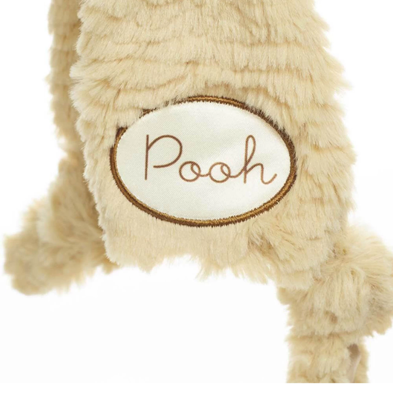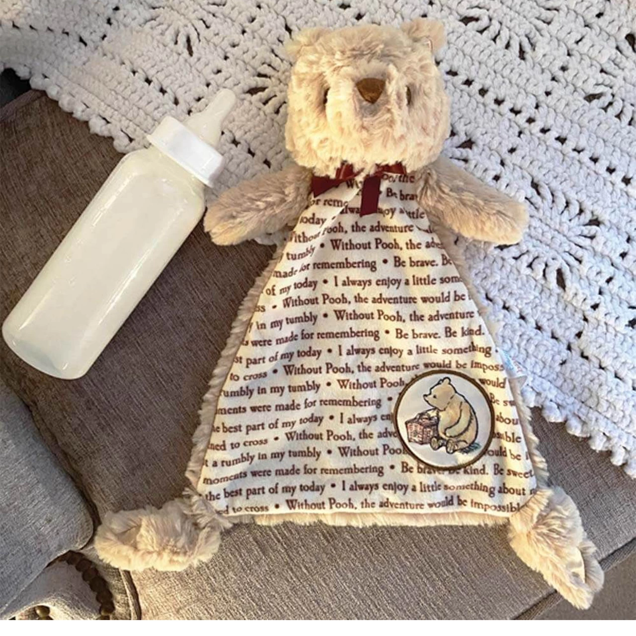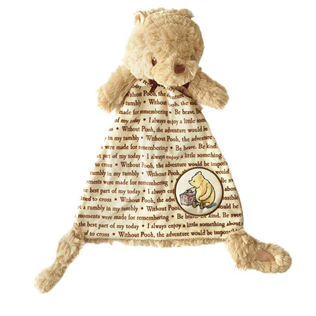Looking for the perfect cuddly sleep companion for your little one? Look no further than this classic Winnie the Pooh comfort blanket! Made from super-soft plush, it features story pages and a sweet satin patch with an adorable Pooh illustration on the front. Plus, the knotted feet add an extra layer of texture, making it great for little ones who love to chew (hello teething!)